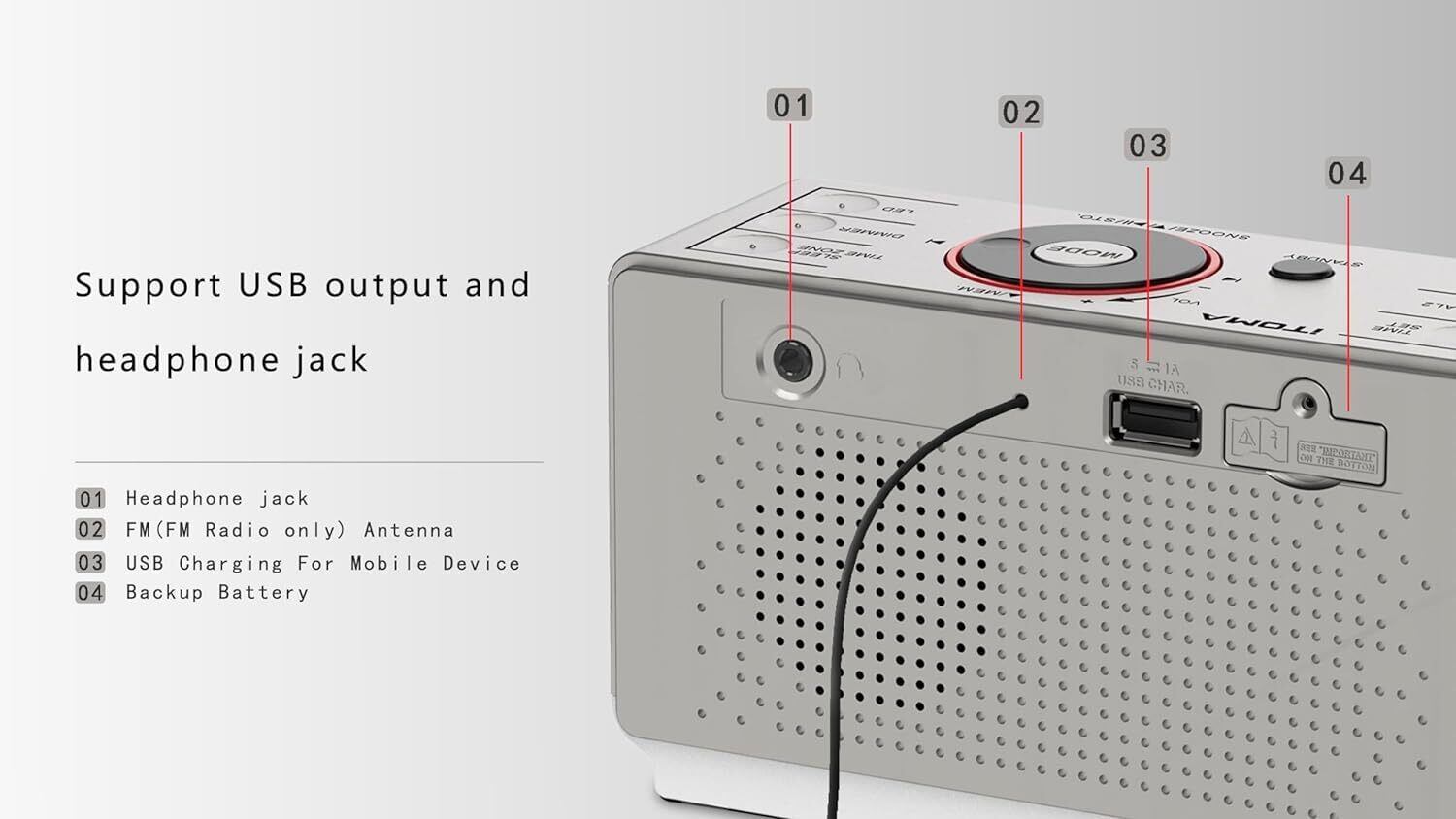 FMラジオ:FMラジオは、20のお気に入りの局をプリセットすることができます;目覚まし時計の設定を記憶させる。FM周波数(76〜108 MHz)は、最大20のプログラム可能なラジオ局のためのメモリストレージを備えています。