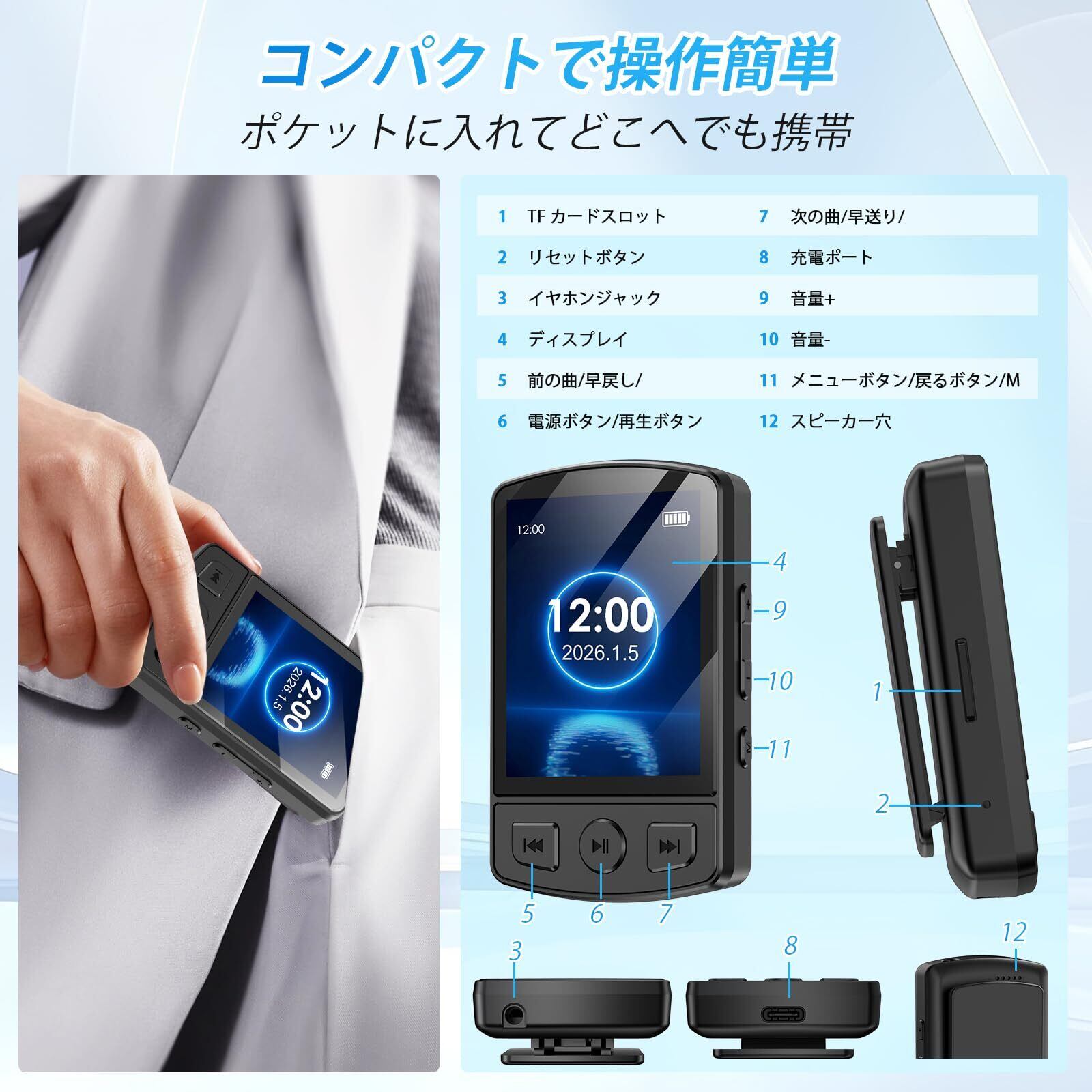 【超軽量・クランプ式設計でスポーツに最適】 わずか数グラムの超軽量ボディに加え、背面に強力なクリップを採用したクランプ式設計により、衣服やポケットにしっかりと固定することが可能です。激しいランニングやジムでのトレーニング中でも本体が揺れたり落下したりする心配がなく、小型で邪魔にならないため、完全ハンズフリーでスポーツに集中できるMP3プレーヤーであります。