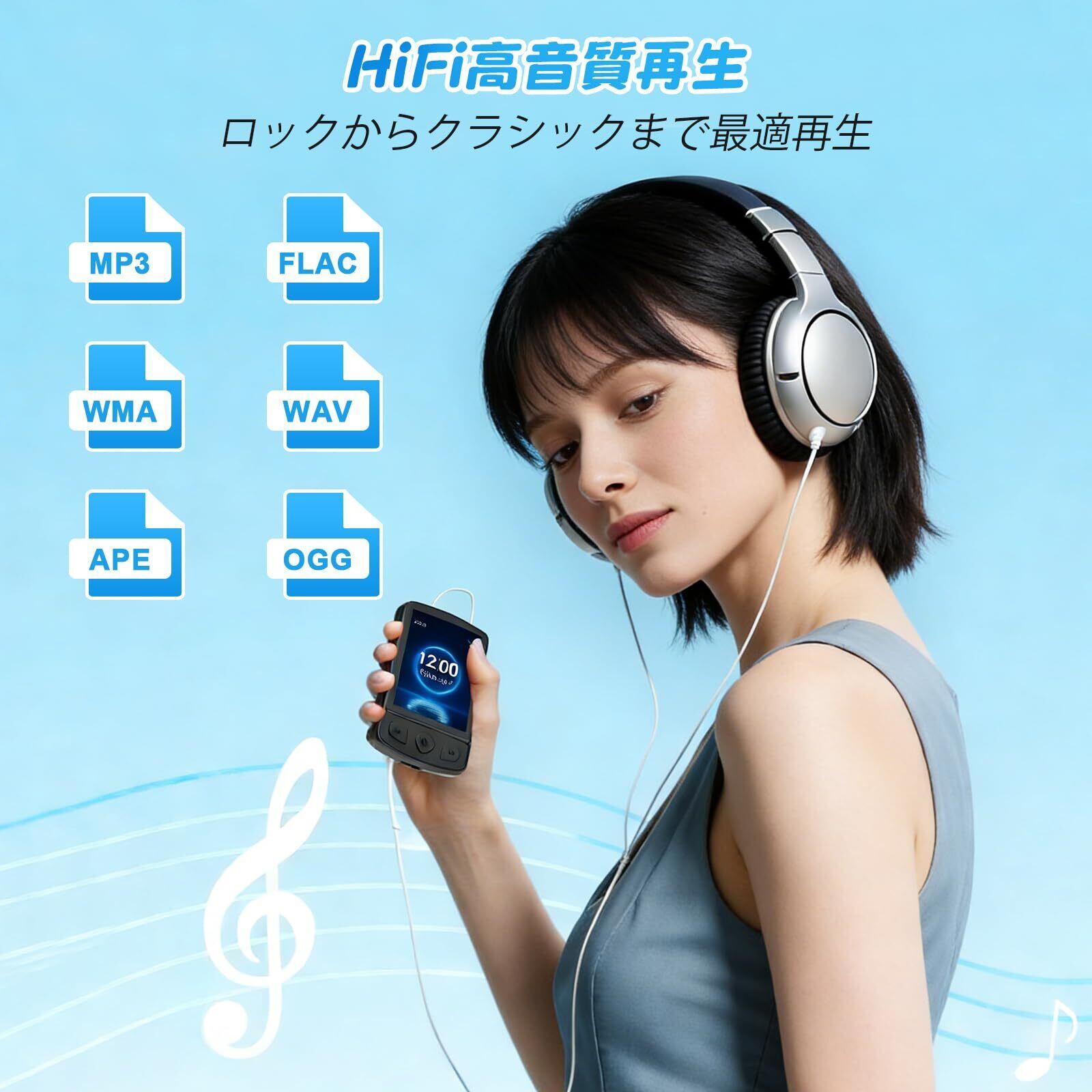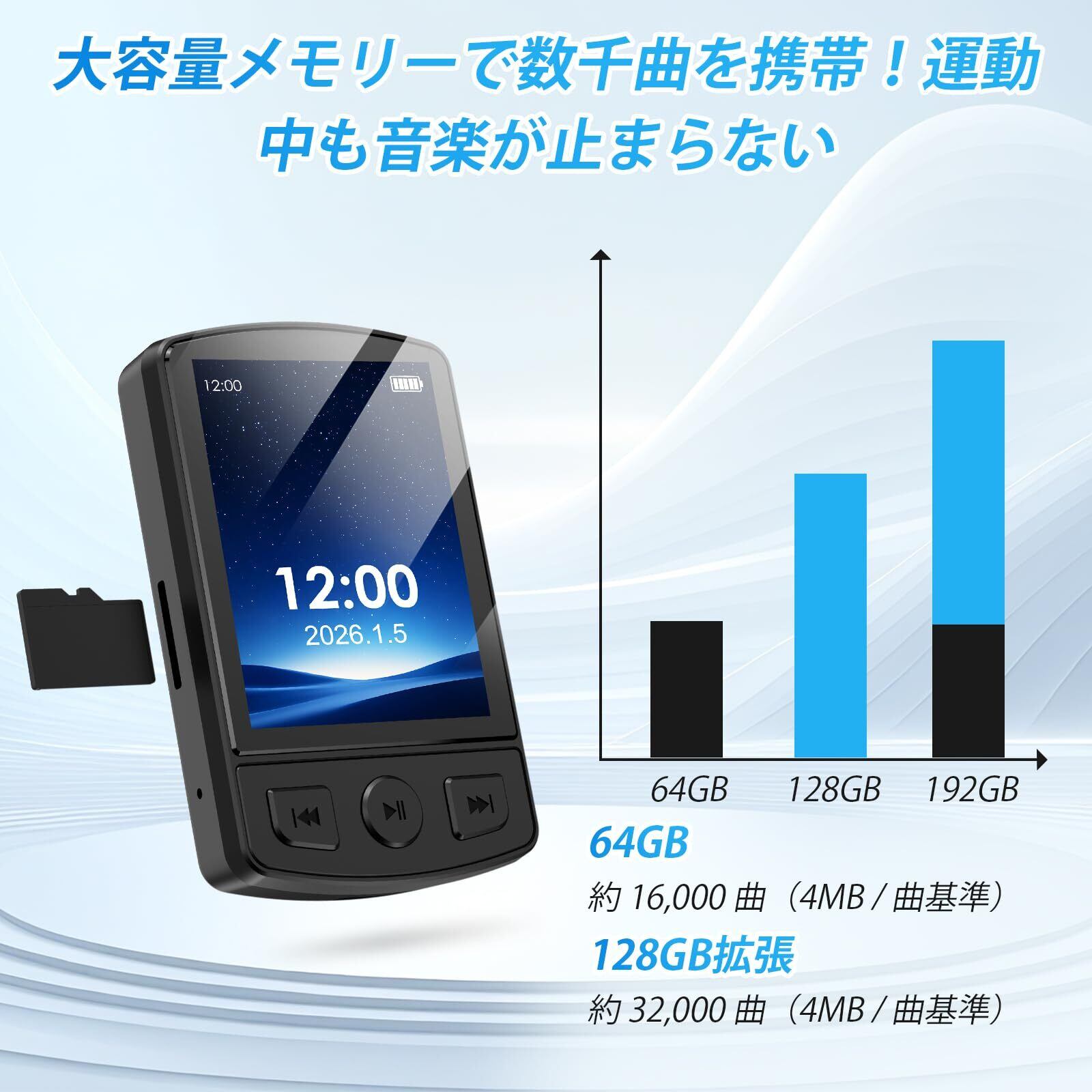 【HiFi高音質・64GBのメモリーカード付属・最大128GB拡張】 原音に忠実なHiFi高音質を実現し、ロックからクラシックまで臨場感あふれるサウンドを提供します。さらに、64GBのメモリーカードが付属しているため、すぐに大容量の音楽をお楽しみいただけます。microSDカードスロットを使用することでメモリを最大128GBまで拡張でき、数千曲以上の音楽ライブラリを持ち運べる大容量対応のMP3プレイヤーとして活躍します。