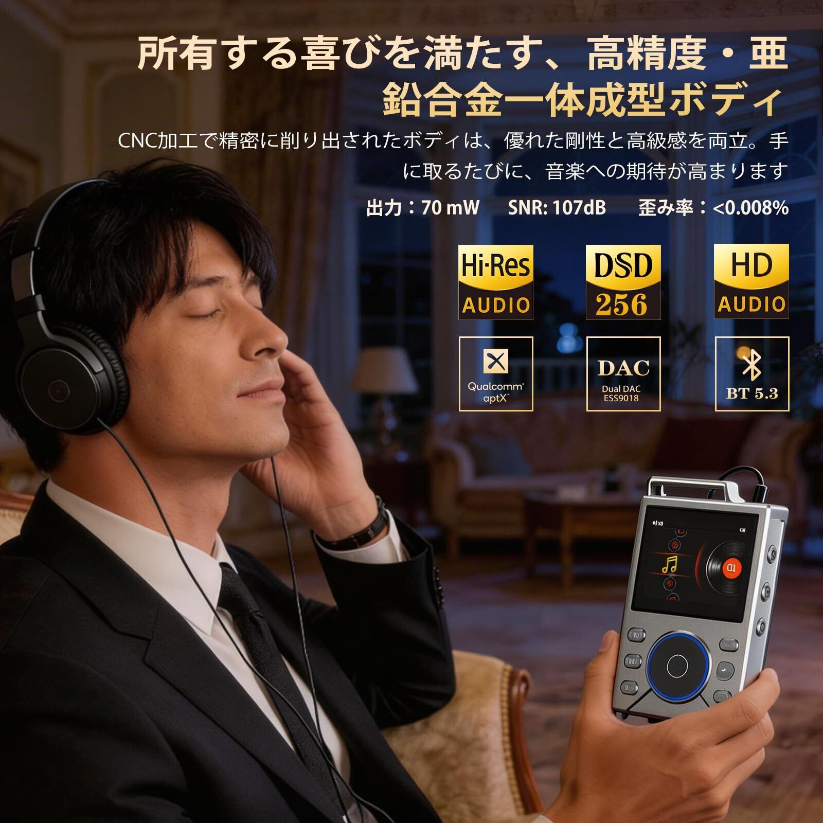【原音を極める圧倒的な高音質&幅広いフォーマット対応】このMP3プレーヤーは、音楽の真髄を体験するための逸品です。DFF/DSFからFLAC/APE/WAVといった非圧縮・可逆圧縮形式まで、様々なハイレゾ対応フォーマットをネイティブ再生します。アーティストの息遣いやスタジオの空気感までも忠実に再現する、真のHIFI 高音質を実現しました。まるでコンサートホールの最前列にいるかのような、没入感あふれる音楽体験を。さあ、いつもの音楽を、最高の音質で再発見してください。mp3プレーヤー