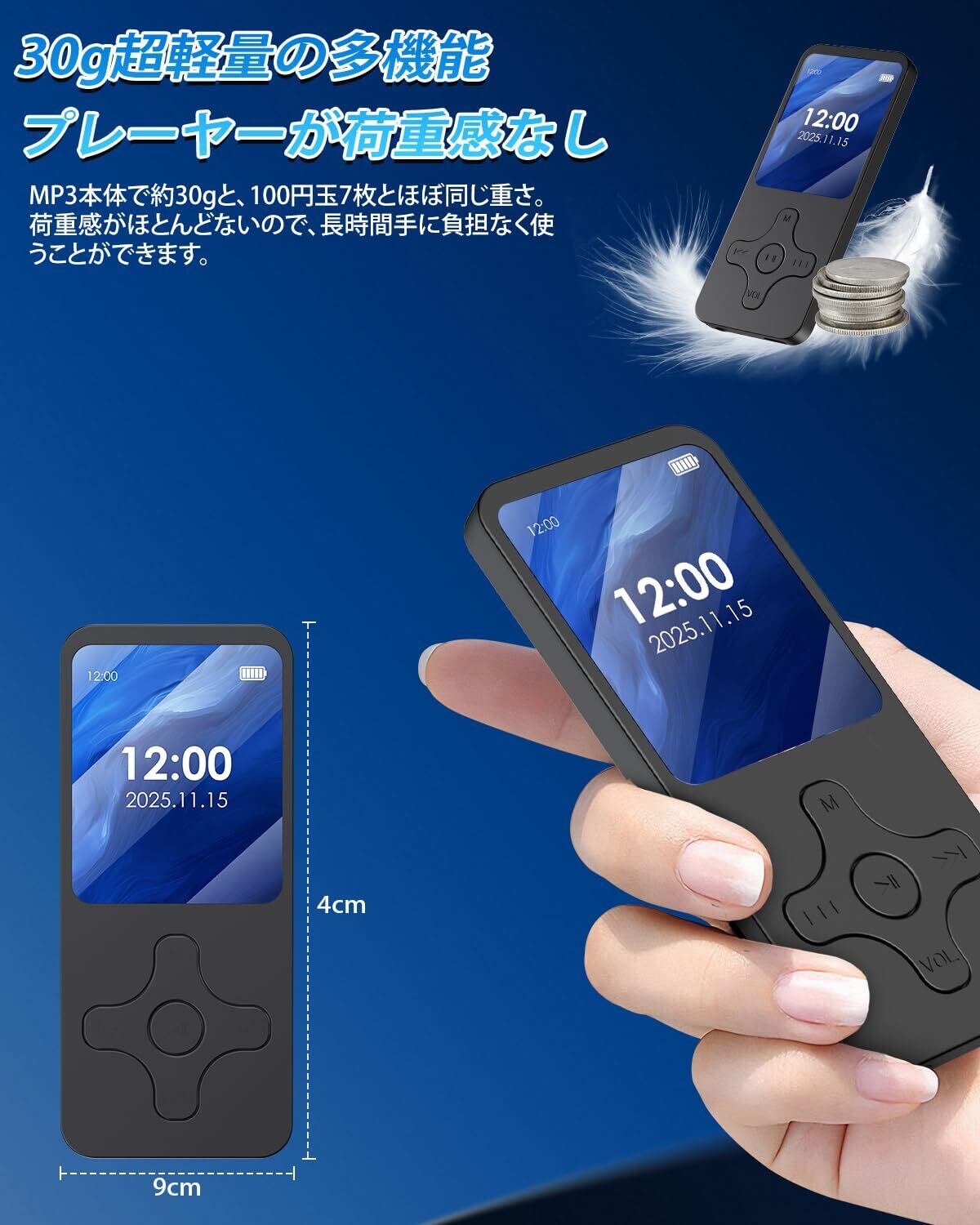 「存在感ゼロの30g:運動や通勤にも邪魔にならない」このMP3プレーヤーは、約30g(約7枚百円玉)という驚異の軽さを実現しました。まるで何も持っていないかのような「存在感ゼロ」の軽快感は、日常のあらゆるシーンであなたの音楽体験をより快適に。ポケットやカバンに入れても、重量感をまるで感じません。特に、ジョギングやヨガ、ランニングなどアクティブな時や、忙しい日々の中でも、この軽さはあなたの動きを決して妨げません。「邪魔にならない」という感覚で、自由に音楽を楽しめます。長時間の持ち運びも、重さに気を取られることなく、疲れにくい心地よさを実感。通勤通学、長旅、長時間の待ち時間など、どんなシーンでも、気軽に、そしてリラックスして音楽に浸ることができます。操作に不慣れな方や、重さに負担を感じる方がいらっしゃることも、この軽さで解消。子供からお年寄りまで、全世代が気軽に、ストレスなくご利用いただける、優しさも感じる設計です。この約30gの超軽量ボディが、あなたの音楽ライフを、よりシンプルで、より豊かで、より心地よいものに変えてくれます。
