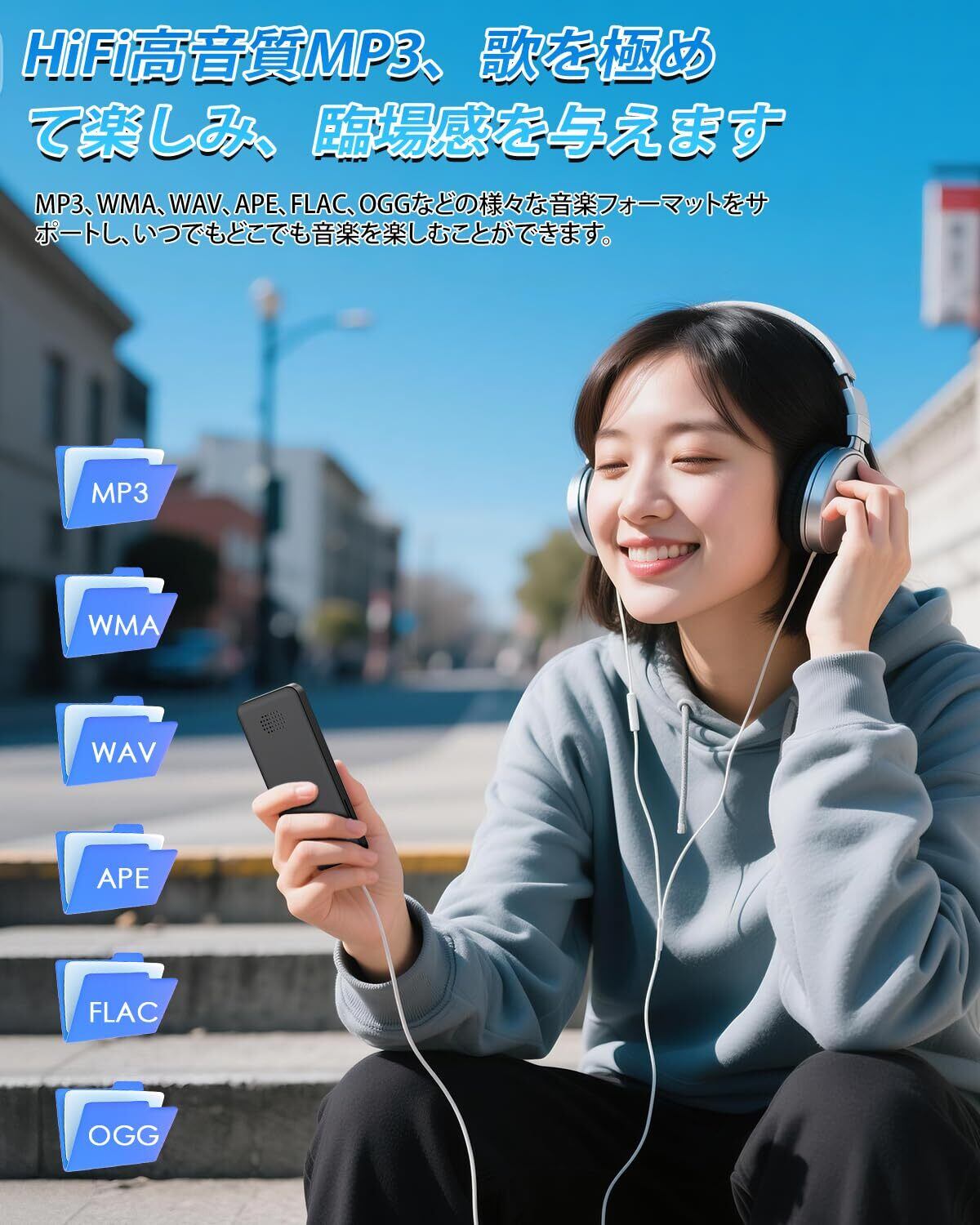 「HiFi高音質&内蔵スピーカーで音楽の世界をどこでもシェアできる!」音楽プレーヤーはMP3、WMA、WAV、APE、FLAC、OGGなど形式のオーディオ再生に対応可能で、あなたの音楽体験を格段に向上させる驚異のHiFi高音質を実現します。従来のプレーヤーとは一線を画すクリアで深みのあるサウンド。ボーカルは鮮明に、楽器の音は生き生きと、あなたの知らなかった音楽の魅力を再発見させます。繊細なニュアンスまでしっかりと再生する高音質を実現することで、あなたの愛する楽曲が、より感情豊かで临場感あふれる体験へと変わります。さらに、オーディオプレイヤーは内蔵スピーカーを搭載している点が大きな特徴です!イヤホンやヘッドホンを使いたくないとき、あるいは複数の人と一緒に音楽を楽しみたいとき…そのようなシーンで、プレーヤー本体から直接音を再生できるのです。お気に入りの曲を友達や家族と、すぐにシェアできるシェアしやすさ。運動中にイヤホンを外したい時、あるいは長時間装着がしんどいと感じる方への対応。パソコンやスマートフォンがない状況でも、気軽に音楽を再生できる手軽さ。旅行先やアウトドアで、ワイヤレススピーカーがなくても音楽を楽しむことができる可能性。このHiFi高音質 によって音楽の奥深い世界を味わい、内蔵スピーカーによって誰かとシェアしたり、手軽に楽しんだりできるこのミュージックプレイヤーは、あなたの多様な音楽シーンを、より豊かに、より楽しくするパートナーになります。今すぐ、その魅力を体験してください。