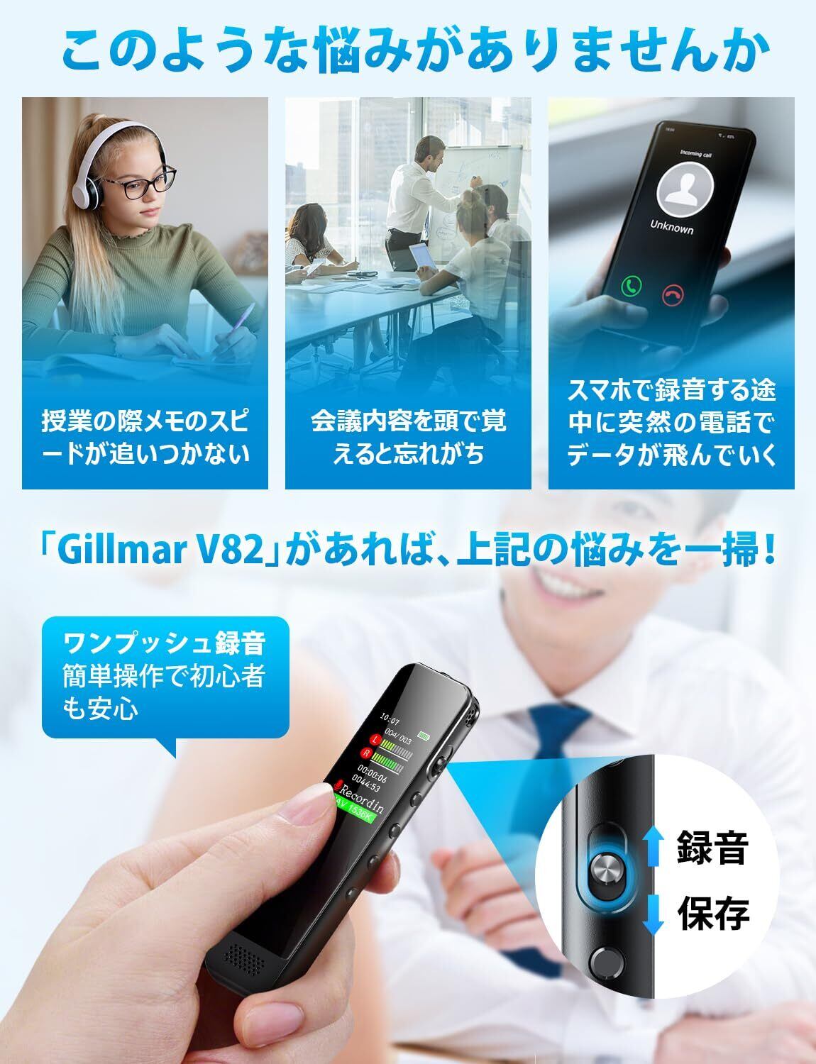【録りたい瞬間を逃さず・ワンボタン高音質録音】ディテールにこだわり機能を重視したGillmarボイスレコーダーは遂に登場しました!録音ボタンをスライドだけで録音をシンプルに開始・保存ができ、簡易な画面で録音情報が一目瞭然で、ICレコーダー裏面にボタン機能がきちんと書かれており、初心者でも直感で録音できます。更に先端コアノイズ除去チップが内蔵され、最大限にノイズを減らし、周囲の雑音を拾わずクリアな録音が可能です。コンパクトなデザインにも関わらず、自動音声検知機能・ノイズキャンセリング機能など多彩な機能が搭載され、使い勝手抜群です。仕事や習い事、日常生活に幅広く活用できます。