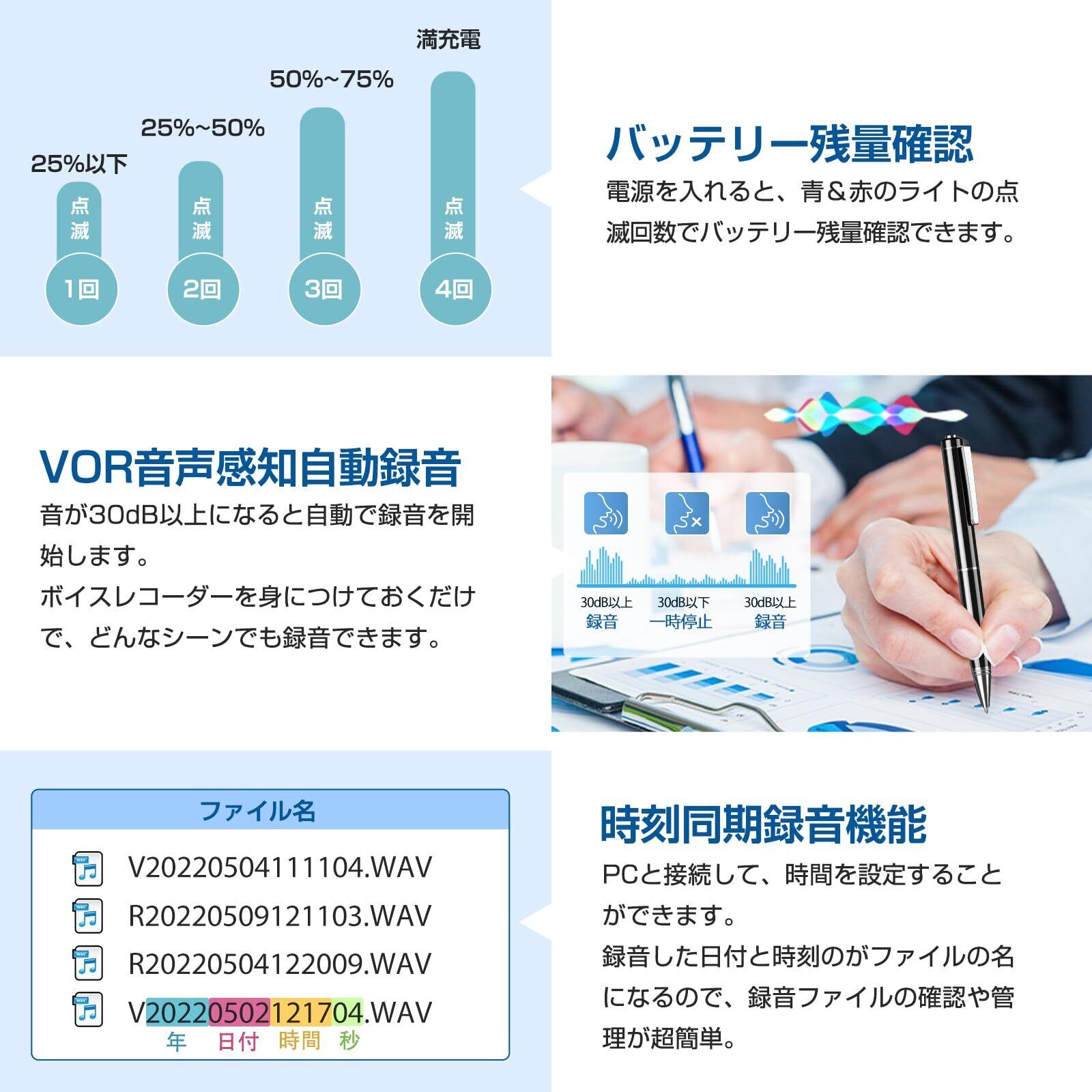 【ボイスレコーダー ペン型 操作簡単】ペン型ボイスレコーダーの見た目はボールペンなので、商談や会議などの相手とやり取りをしているときに、違和感なく書きながら、周りにバレなし会話を録音できます。セクハラやパワハラ対策として、職場で大活躍できます。操作かんたん、録音ボタンを長押すと、赤と青ライトが点滅(点滅の回数でバッテリー残量が確認可能)、その後赤いライト3回点滅してから消灯、録音スタート!※ご注意:録音中にボイスレコーダーをイヤホンと接続すると、録音再生の状態になります。