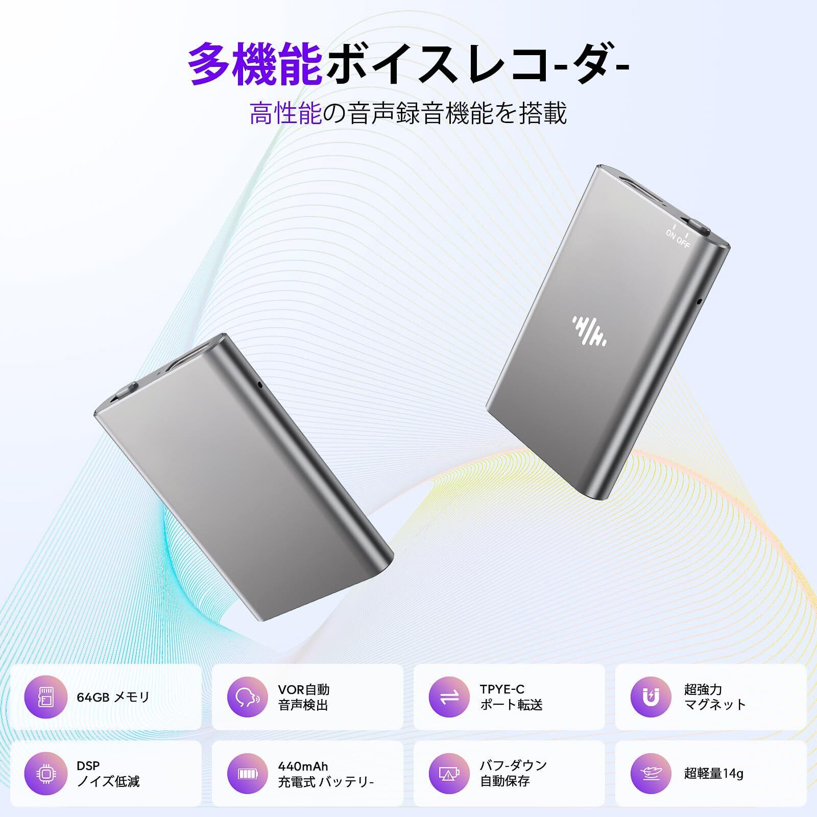 64GB大容量ボイスレコーダー 超小型 ICレコーダー 48時間連続録音 VOR音声感知録音対応 OTGスマホ接続可 ノイズキャンセル機能 ワンタッチ録音 タイマー録音 MP3音楽再生 リピート再生 会議/インタビュー/語学学習に最適
