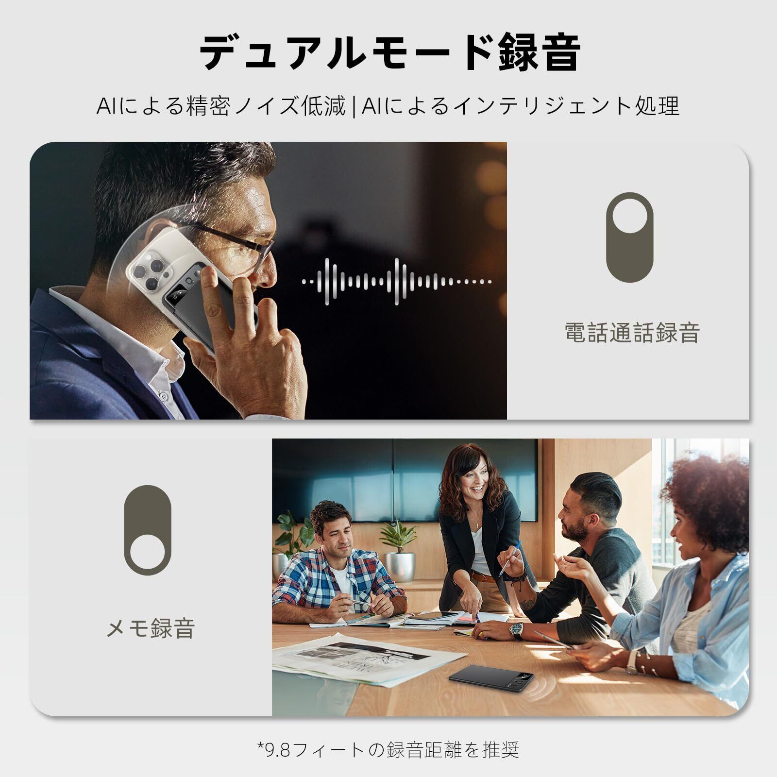【デュアルエンジン録音で鮮明な音質】この音声レコーダーは、2つの音響エンジンで詳細を鮮明に録音します: ノート録音:AI技術によるノイズリダクションで、正確な音源録音を実現。電話録音:振動伝導とAIチップによるサポートで、携帯電話の内部通話音をインテリジェントに拾い、通話内容に集中します。