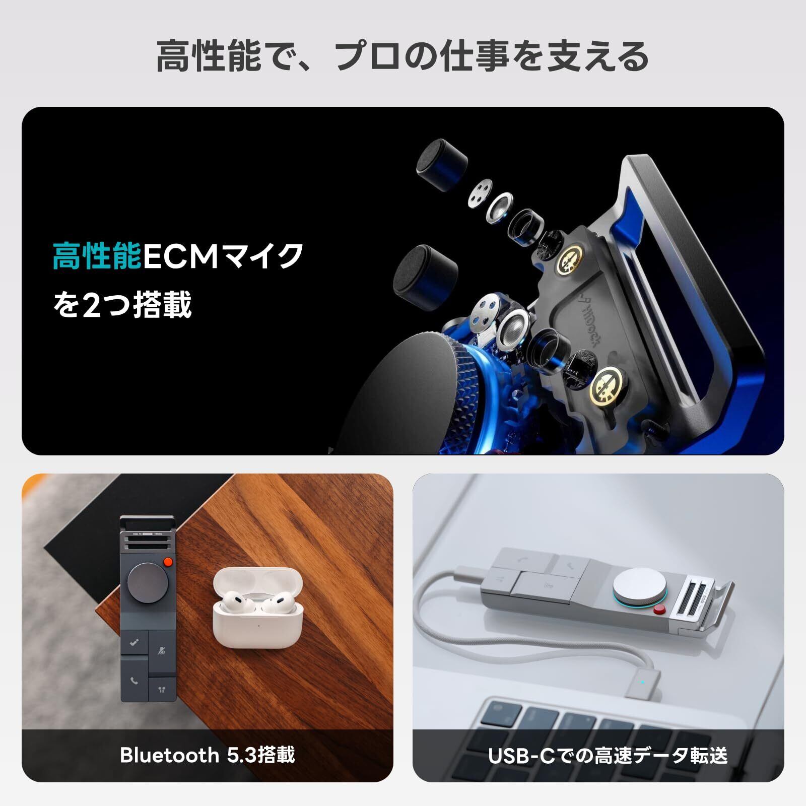 【直感操作とクールなデザイン】録音の開始から音量調整やBluetoothイヤホンの接続まで、本体のボタンでスムーズに操作できます。マグネット内蔵のため、ホワイトボードやペグボードはもちろん、付属の金属プレートを使えばPC裏にも装着可能。さらに、同梱のUSB-Cケーブルにはタッチコントロール機能を搭載し、ケーブルから録音の開始・停止を操作できます。