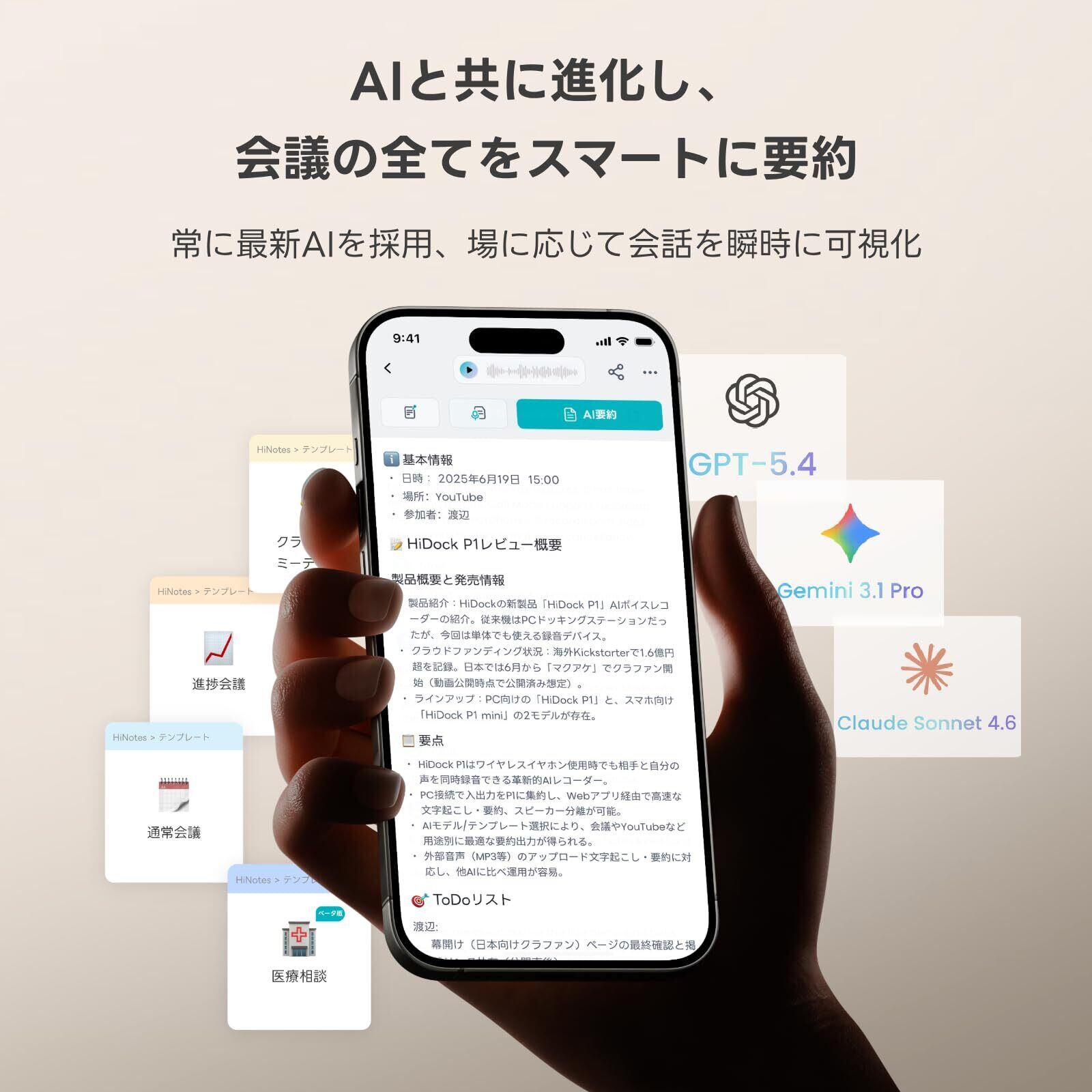 【文字起こしと要約が無制限かつ無料】HiDock P1をご購入いただくと、専用アプリ「HiNotes」のメンバーシッププランが無料特典として付属。最新AIによる文字起こしと要約機能が利用回数・時間ともに制限なく無料で利用でき、あなたの生産性向上を継続的にサポートします。