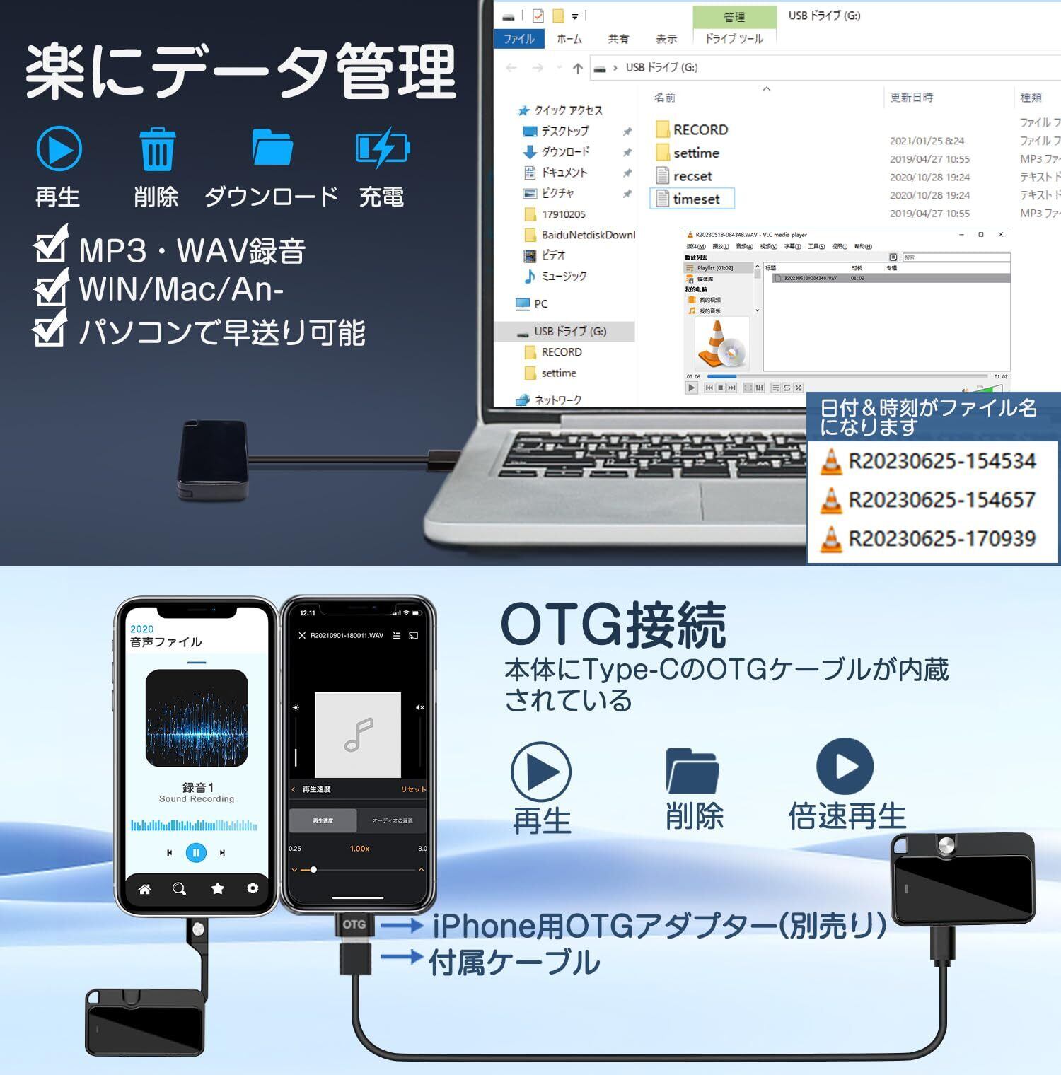 【業界新登場Type-Cケーブル内蔵&スマホ転送&スマホで倍速再生】内蔵のType-C USBケーブルによる迅速でシームレスなデータ転送をお楽しみください。ボイスレコーダーをAndroidスマホ&Macやその他の対応機器に簡単に接続し、録音ファイルの再生&削除&バックアップを簡便に行えます。更に、スマホで再生する時、倍速再生することもでき、好みの速度で録音を確認できます。(iPhoneに接続する場合は、iPhone用のOTGアダプターが必要です。別売り)