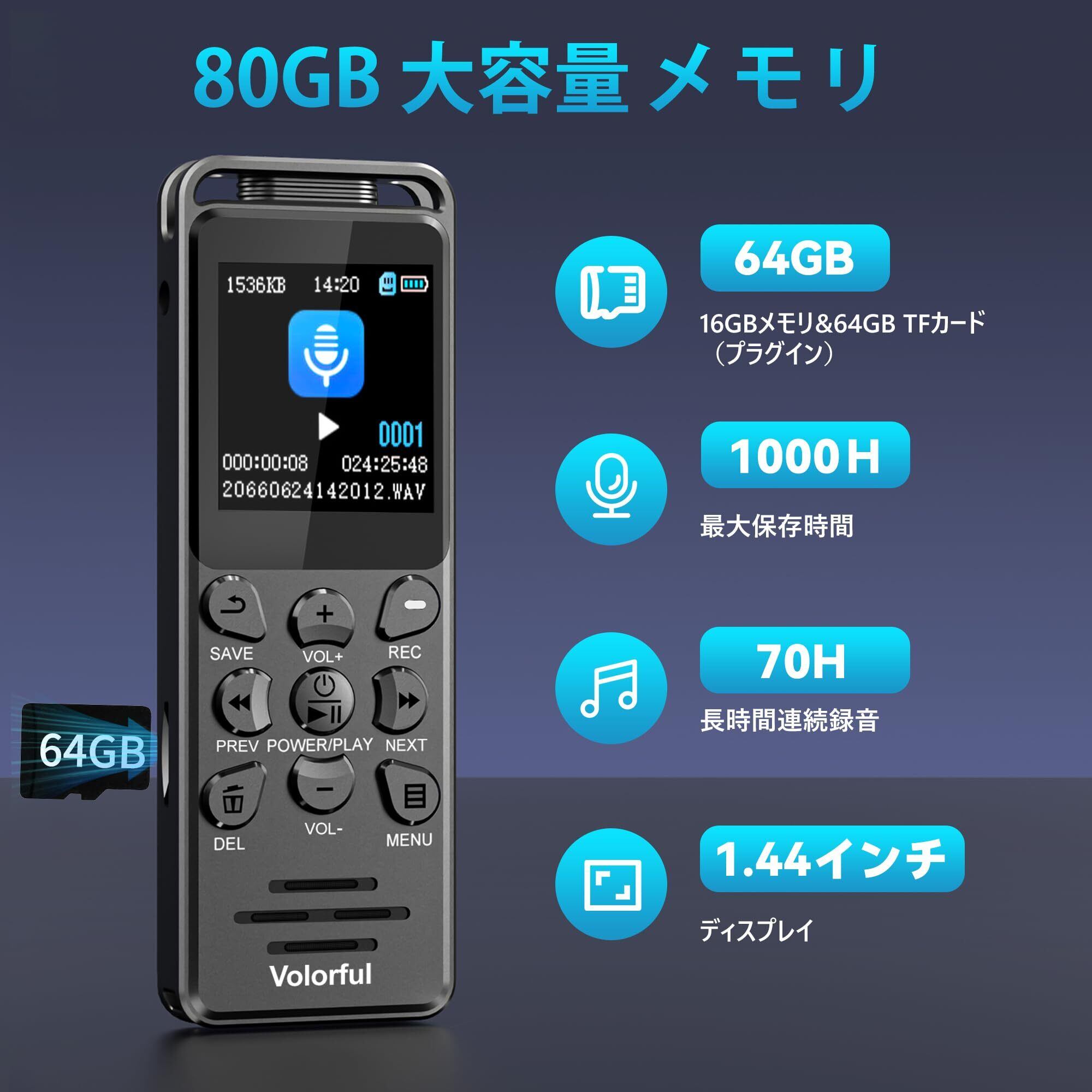 ボイスレコーダー 小型 80GB大容量 70時間連続録音 ICレコーダー 長時間録音保存 1.44インチ液晶 録音機 ワンタッチ録音 SDカード対応 VOR録音 速度調整 A-Bリピート パスワード保護 外部マイク対応 持ち運び便利 会議/インタビュー/語学学習 日本語取扱説明書 ブラック
