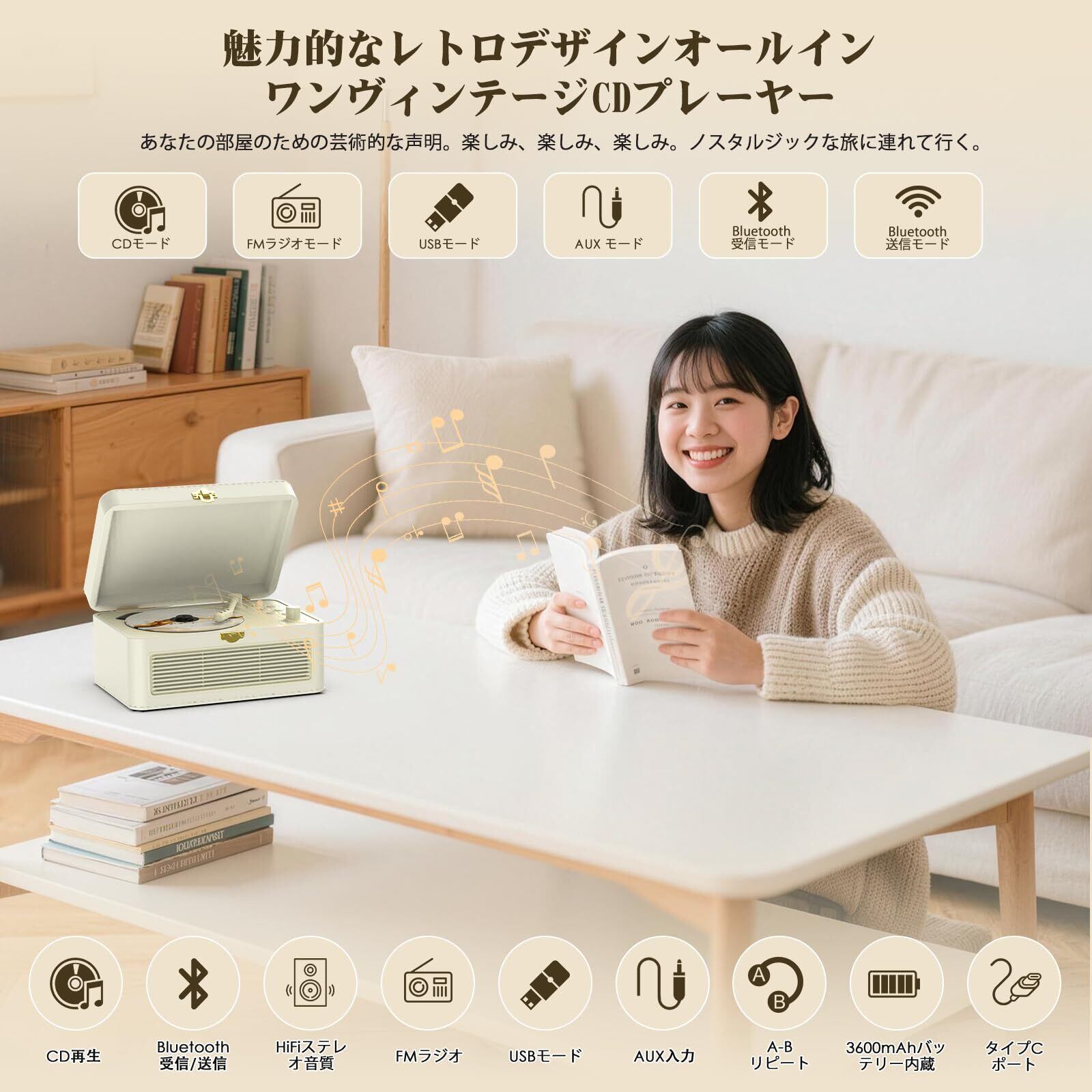 Gueray CDプレーヤー レトロ Bluetooth受信&送信 HiFIスピーカー内蔵 充電可能 ポータブル cd player USB再生 AUX入力 A-Bリピート機能 遠隔操作 FMラジオ CDラジカセ イヤホン対応 語学学習 音楽鑑賞 日本語取扱説明書付き Y-02 ベージュ色