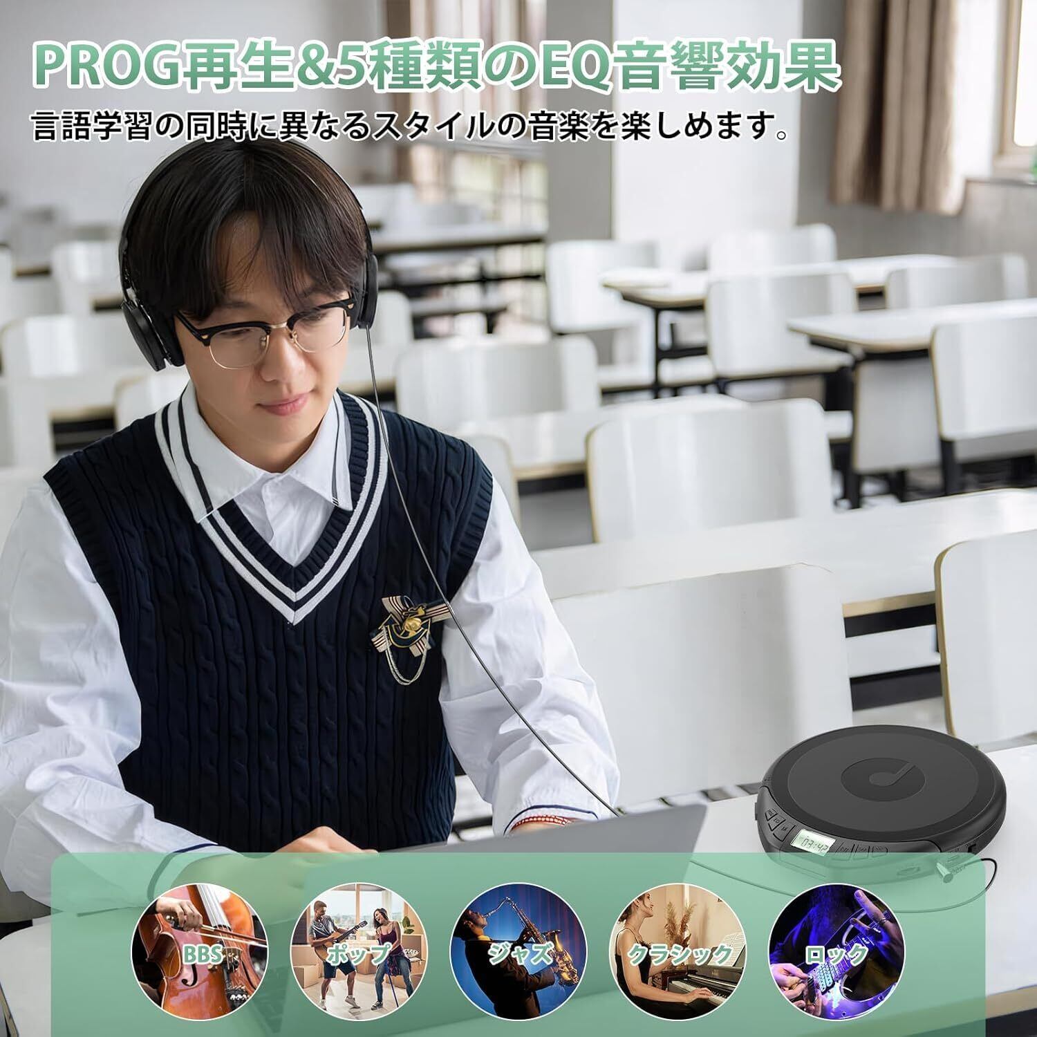 【PROG再生モード&EQ音響効果】PROGプログラム機能を搭載したH01 cdプレイヤーは、お好きな順番で気に入りの曲を再生することができ、個性的な音楽体験を実現できます。さらに、BBS/ポップ/ジャズ/ロック/クラシックという5種類のEQ音響効果で、言語学習の同時に、異なるスタイルの音楽を楽しむことができ、学習の楽しさを高めます。