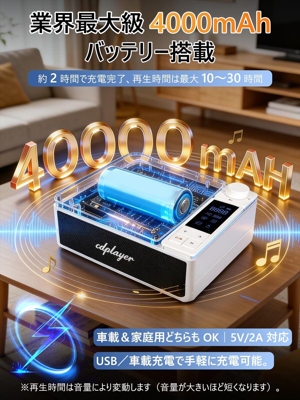 【4000mAh大容量バッテリー・長時間再生】4000mAhの大容量バッテリーを搭載したポータブルcdプレーヤーで、長時間の連続再生が可能。コードレスで使用できるため、リビングや寝室だけでなく、アウトドアや旅行先でも活躍します。コンパクト設計で持ち運びも便利です。