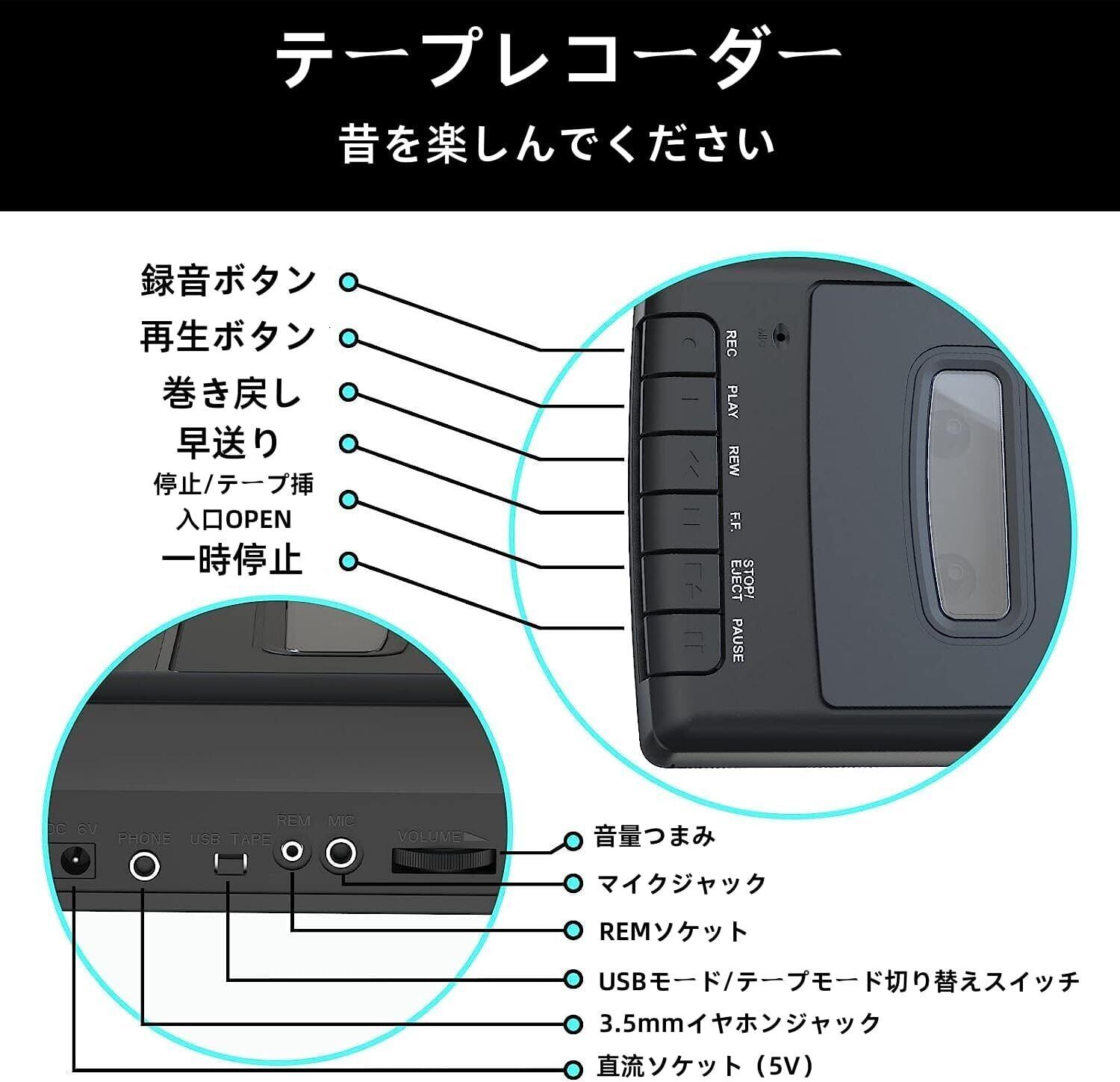 カセットプレーヤー、MP3変換デジタル化対応、 PC不要、カセットテープレコーダー・録音・再生可能テープレコーダー、カセットテープ デジタル化、USBメモリー録音機能・マイク付き・スピーカー内蔵・3.5mmイヤホン端子・携帯便利