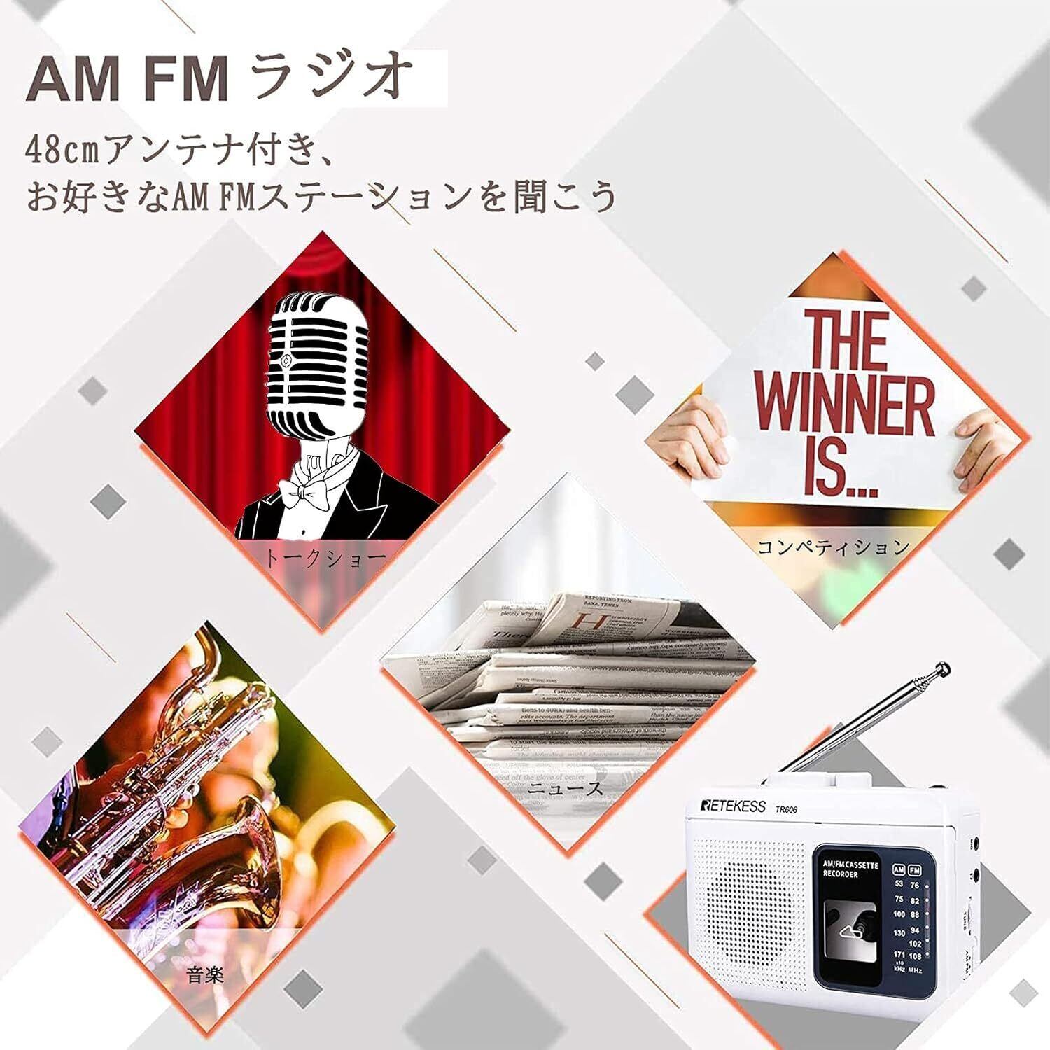 【AM/FMラジオ】 AM:530-1710KHz、FM:76-108MHz、48cmの伸縮式アンテナ付き、テープを再生しながらラジオを楽しむことができます。