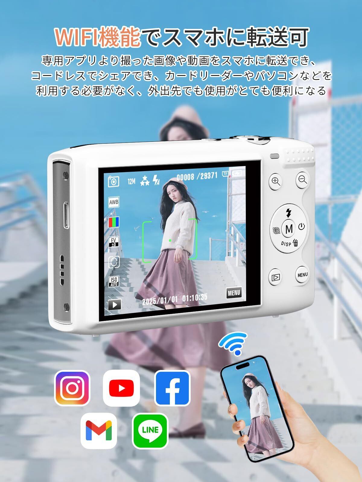 AiMike スマホに送れる デジタルカメラ 5K デジカメ WIFI転送機能 7200万画素 64GBマイクロSDカード付き 16倍デジタルズーム オートフォーカス機能 LEDライト ウェブカメラ 2.8インチ大画面 バッテリー2枚 コンパクト 子供や初心者向け 子供の日 クリスマスプレゼント アイボリーホワイト