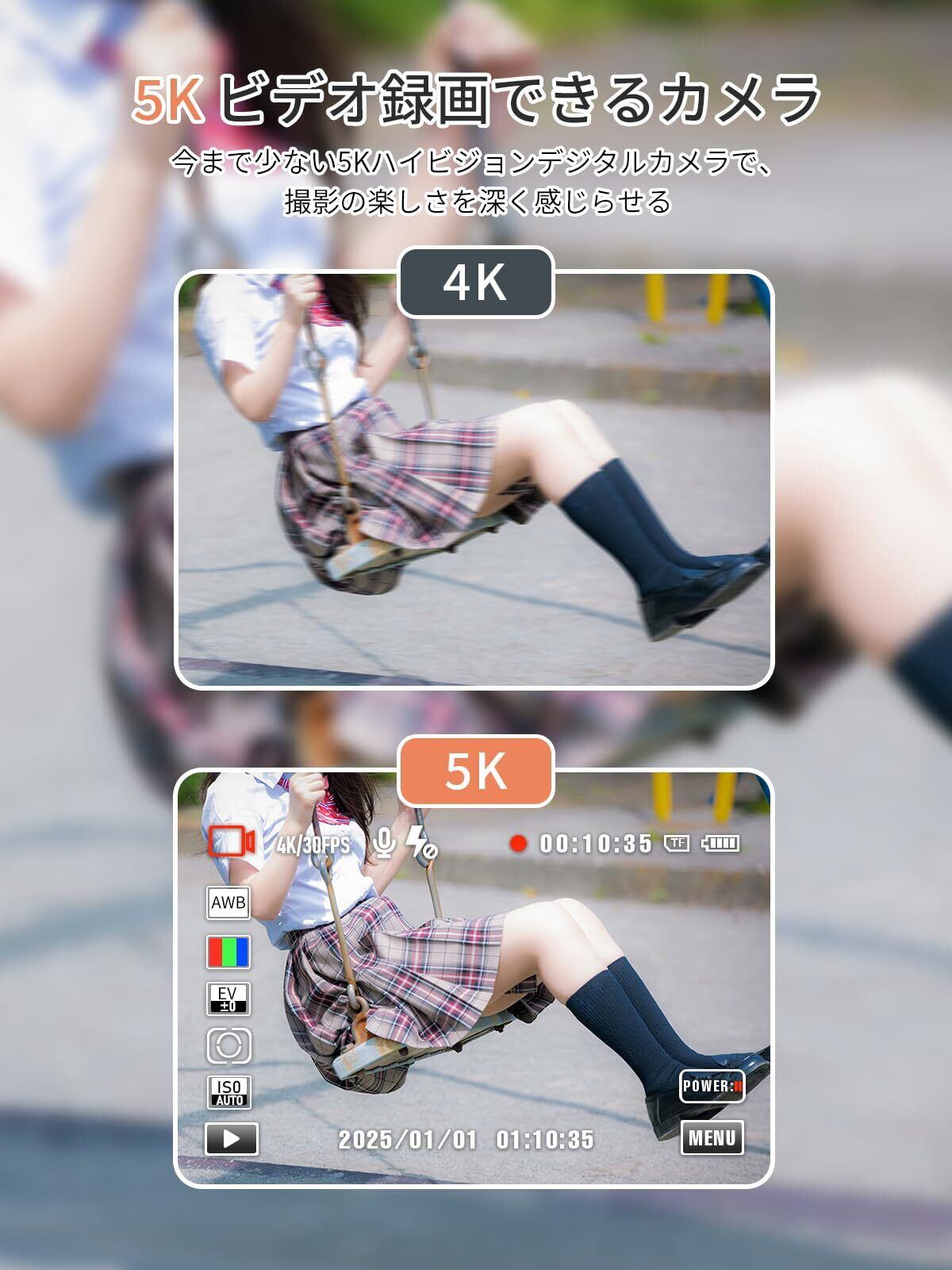 【機能豊富&2.8インチ大画面】ほかには多種類フィルター、セルフタイマー、連続撮影、スローモーション、タイムラプス、ループ録画などの多彩な機能を搭載しており、初心者の方でも撮影を楽しめる5Kカメラです。高画質ビデオ通話や生放送を行うなどウェブカメラとしてもお使いいただけます。LEDライトも付属しているので、夜間や暗い部屋での撮影も簡単に行うことができます。2.8インチIPS液晶モニターを採用しており、大画面で被写体をはっきり確認できます。また、本体重量はわずか114g(バッテリー含み)と非常に軽量で、女性や学生でも長時間使用できる、コストパフォーマンスの高いデジタルカメラです。家族写真、運動会、忘年会、卒業式、旅行、イベントなど、さまざまな場面でお使いいただけます。