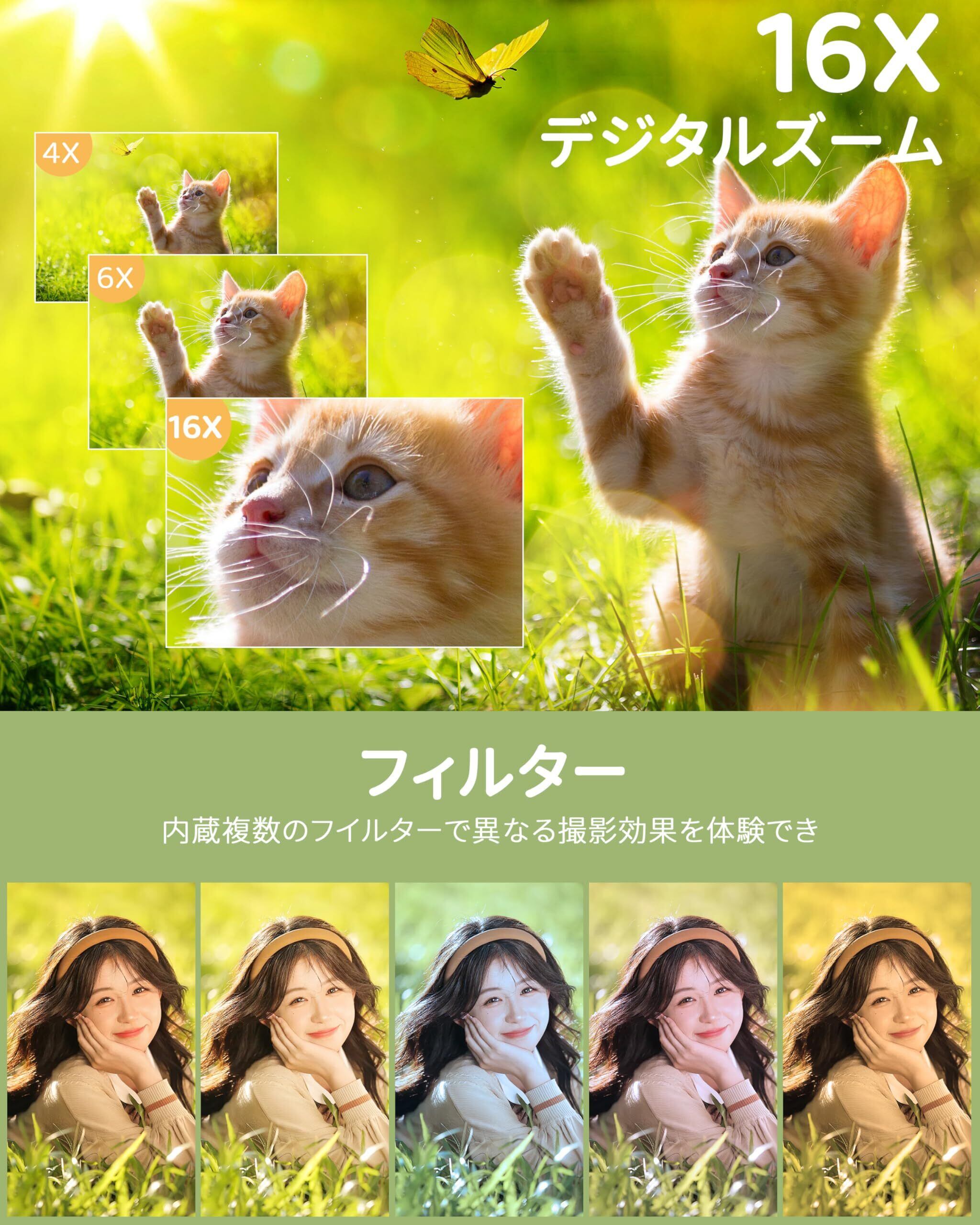 【使いやすい多機能のデジカメ】このデジカメ4kはたくさん機能があります。例えば:笑顔検出、連続撮影、自動撮影、時間指定セルフィーなどのさまざまなインテリジェントな撮影機能により、忘れられない瞬間を簡単に撮影できます。付属のストラップで手に持って、あるいはポケットに入れて持って行けるので、旅行をする時などにとても便利です。結婚式、入学・卒業式、旅行、運動会などの記録に最適です。