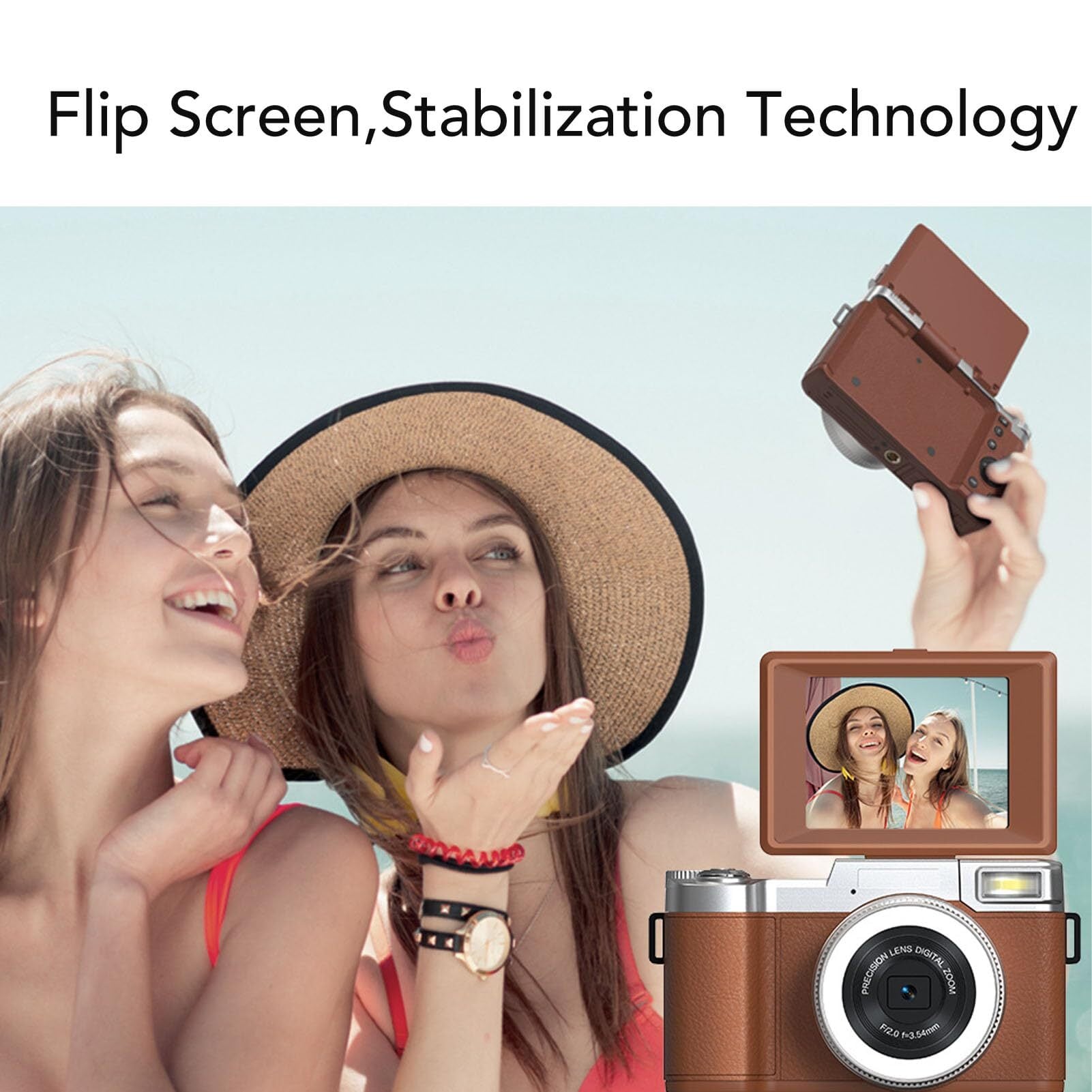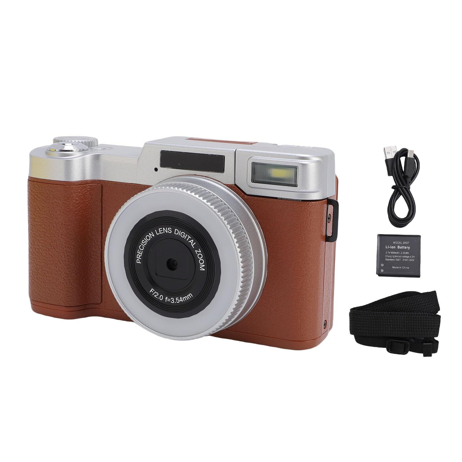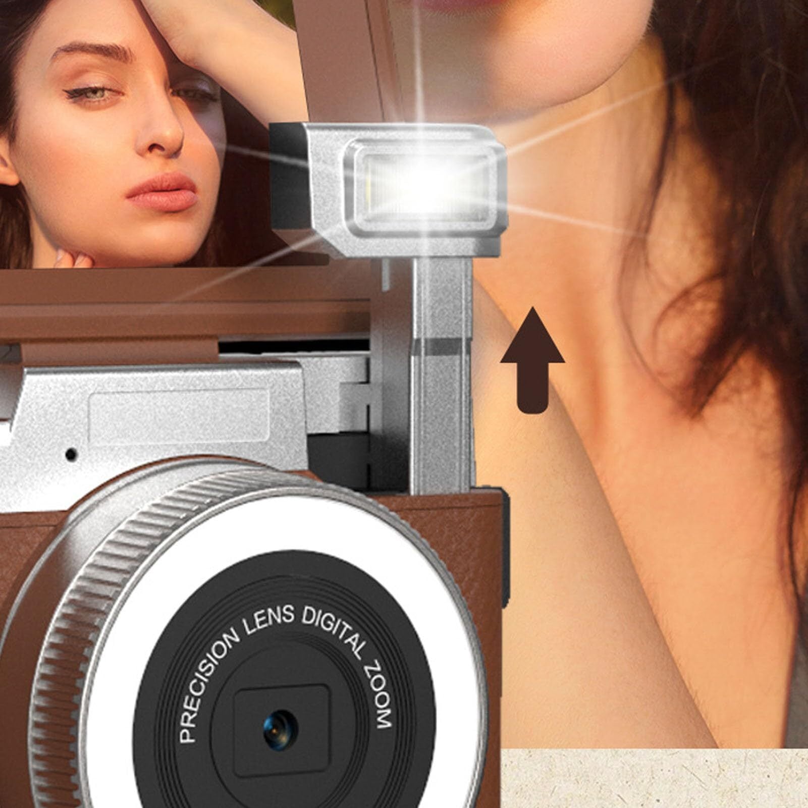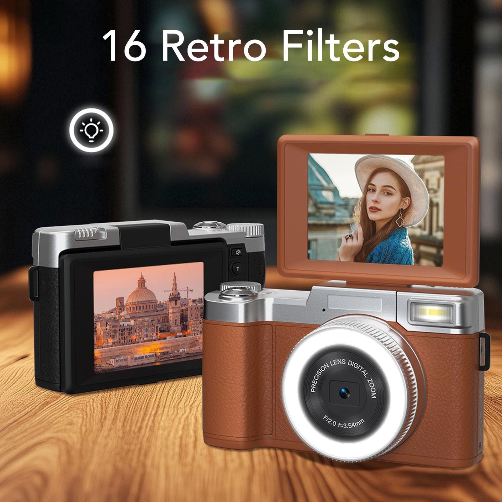 Dpofirs 写真撮影用4Kデジタルカメラ、オートフォーカス、16種類のレトロフィルター付き、YouTube用64MPビデオブログカメラ、フリップスクリーン付き、初心者向けコンパクト旅行カメラ (茶色)
