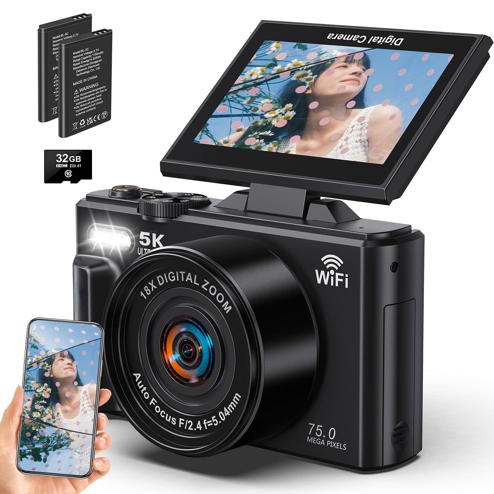 Beho デジカメ 7500万画素 5K録画 デジタルカメラ スマホに送れる Wi-Fi機能 180度回転可能ディスプレイ 3.0インチ大画面 18倍デジタルズーム オートフォーカス 連続撮影 自撮り 32GBマイクロSDカード付き 学生 初心者 修学旅行 Vlog 小型 コンパクト 軽量 携帯便利 ポケット カメラ