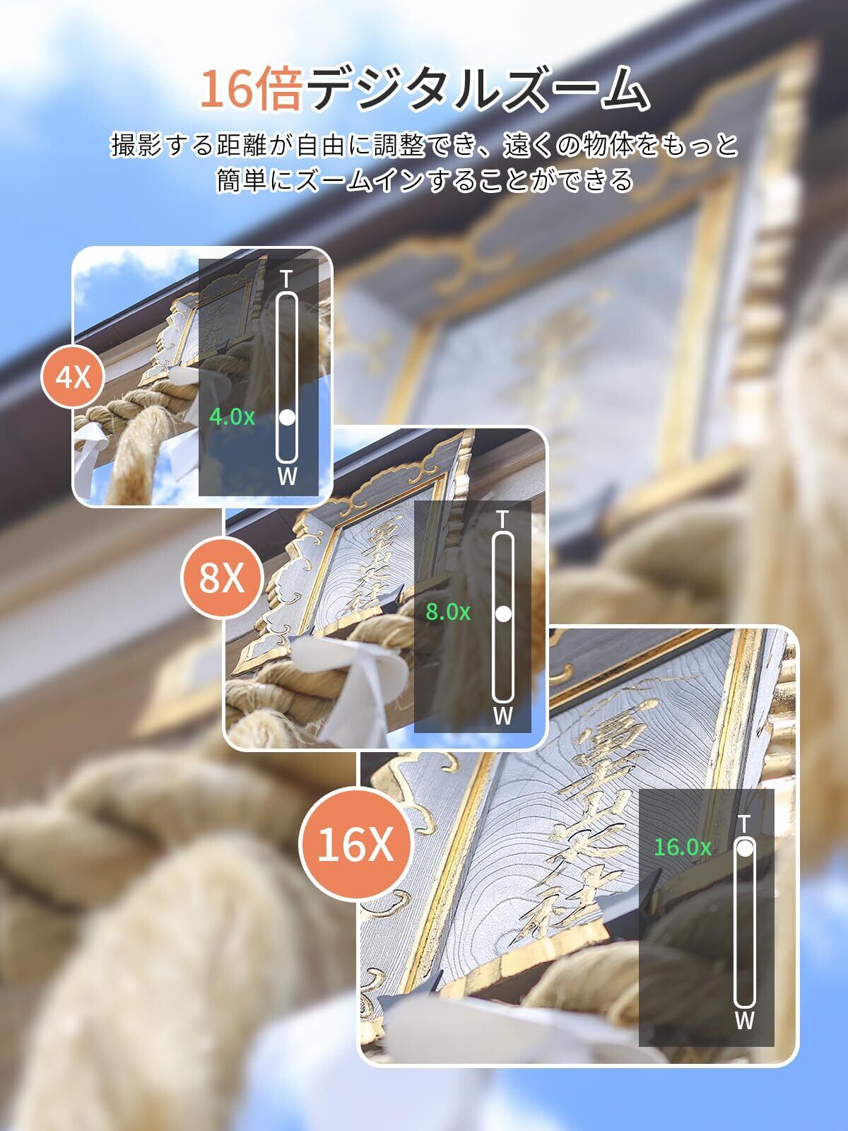 【1300万CMOSセンサー&5K録画&7200万画素】1300万CMOSセンサーを採用されており、強力なアルゴリズムのサポートにより、被写体を明確的に識別でき、手頃な価格で鮮やかな映像を撮影できます。最大5Kの圧倒的解像度で動画撮影!優れた5Kビデオ解像度と7200万画素の画質で、花びらの質感や、おしべの細かいディテールなど細かい部分まで詳細に写っており、非常にシャープで抜けのいい描写です。細かくて小さい被写体もきめ細やかに写り、リアルに再現します。本体に搭載されているレンズのスペックはF値「F/3.2」、焦点距離「7.36mm」です。