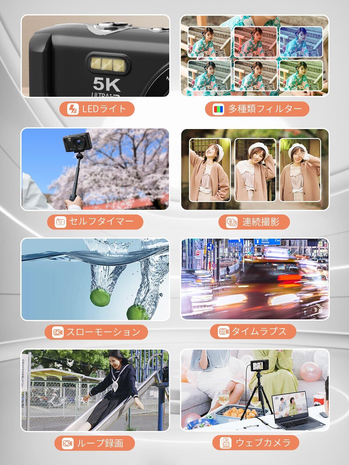 【機能豊富&2.8インチ大画面】ほかには多種類フィルター、セルフタイマー、連続撮影、スローモーション、タイムラプス、ループ録画などの多彩な機能を搭載しており、初心者の方でも撮影を楽しめる5Kカメラです。高画質ビデオ通話や生放送を行うなどウェブカメラとしてもお使いいただけます。LEDライトも付属しているので、夜間や暗い部屋での撮影も簡単に行うことができます。2.8インチIPS液晶モニターを採用しており、大画面で被写体をはっきり確認できます。また、本体重量はわずか114g(バッテリー含み)と非常に軽量で、女性や学生でも長時間使用できる、コストパフォーマンスの高いデジタルカメラです。家族写真、運動会、忘年会、卒業式、旅行、イベントなど、さまざまな場面でお使いいただけます。