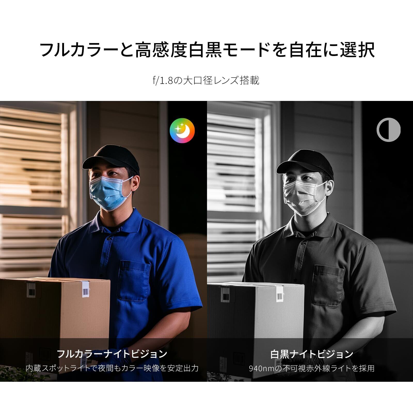 【夜間視界も完璧:フルカラーと赤外線白黒モード】f/1.8の大口径レンズにより、暗い環境でも内蔵スポットライトが鮮明な映像を提供します。夜間モードではフルカラーと高感度白黒モードを切り替えることができ、どんな暗闇でもしっかりと監視が可能です。