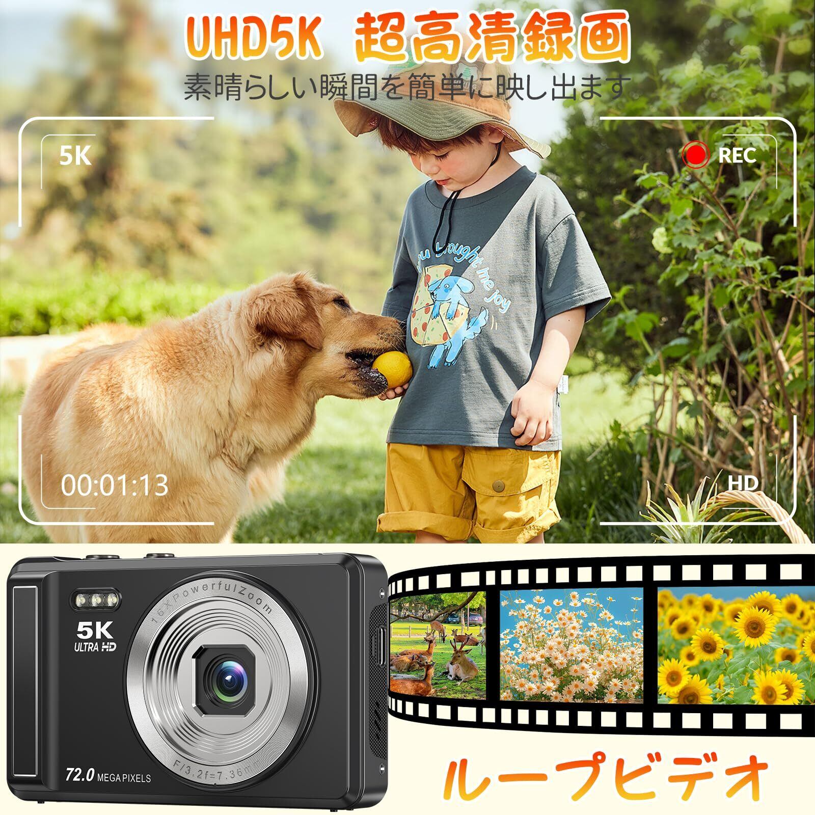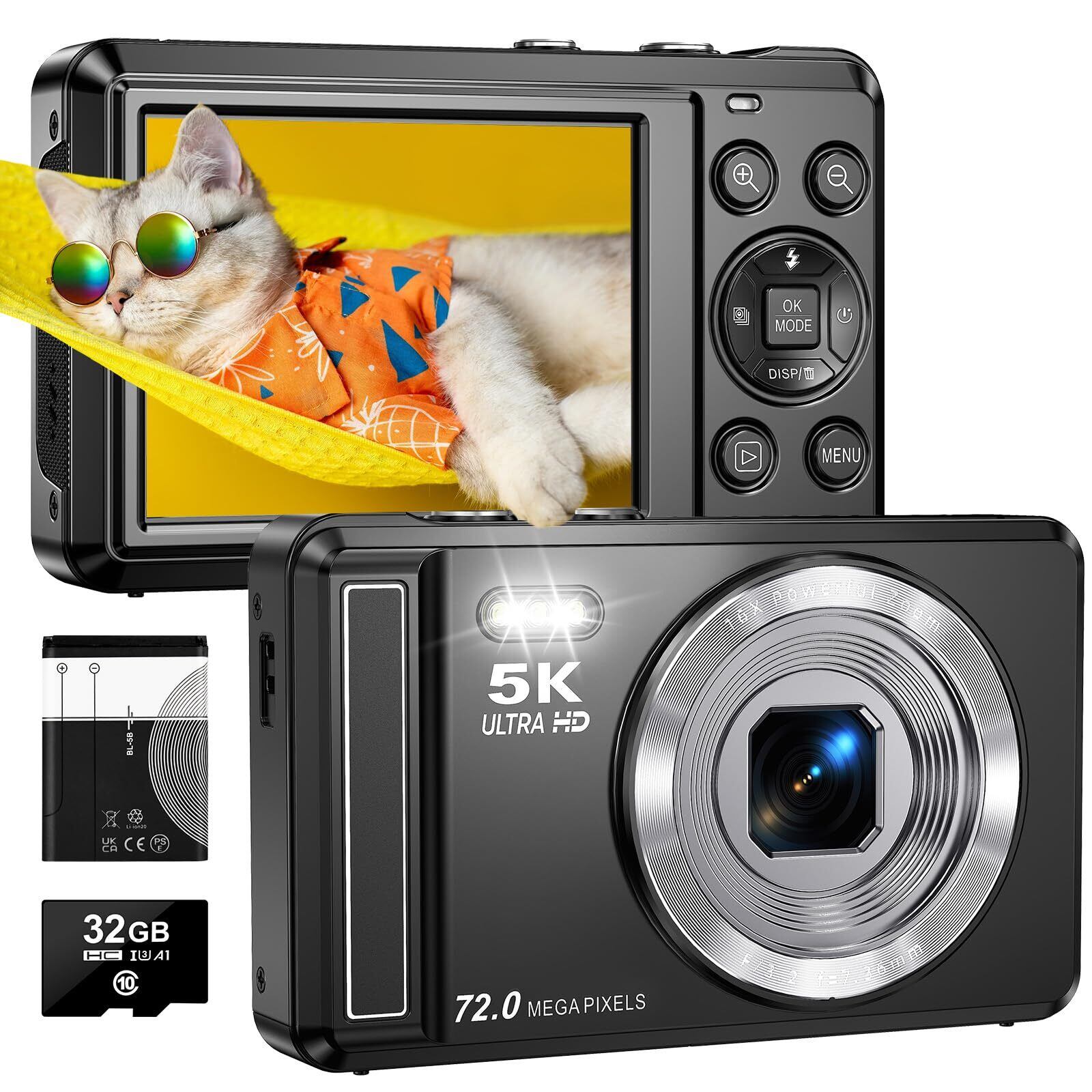 デジカメ 5K 7200万画素 AFオートフォーカス デジタルカメラ 2.8 インチスクリーン 16 倍デジタルズーム 定時撮影 内蔵フラッシュ 自撮り 32GBマイクロSDカード付き初心者向け 誕生日 旅行 コンパクト VLOG カメラ