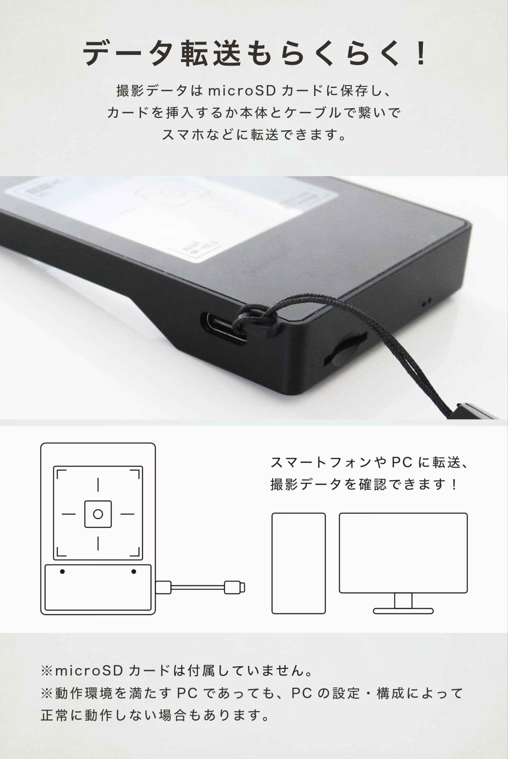【SPEC】 本体サイズ:約W59.2×H85×D13mm/本体重量:約28g/同梱物:カメラ本体、ストラップ、取扱説明書、USBケーブル/LCDモニター:なし/イメージセンサー:CMOS(約130万画素)/静止画解像度:1200×1440/静止画形式:JPG/動画形式:AVI/動画解像度:400×480(30fps)/レンズ:3.2mm F2.8/撮影距離:約0.3m~∞/シャッタースピード:1/125秒/スピーカー:あり/マイク:内蔵/対応メモリーカード:microSD(Class4~10/4~32GB)※別売/USBケーブル:Type-C/Type-A(約60cm)/内蔵電池:リチウムイオンポリマー電池150mAh/動作環境:Windows XP、Vista、7、8(32/64bit)、10、11、Mac/保管温度:0℃~40℃/防水性能:非防水 ※仕様および機能は改良のため予告なく変更される場合があります。