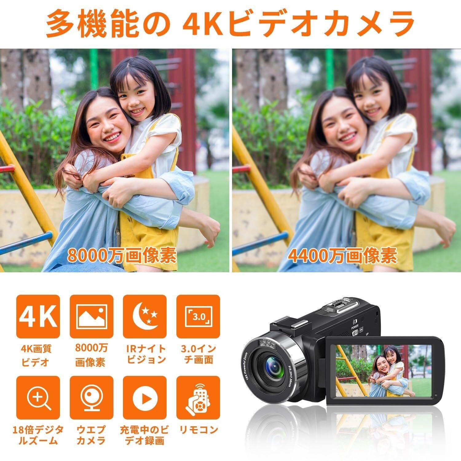 ビデオカメラ4K動画8000万画像数YouTubeカメラ ウェブカメラ 18倍デジタルズーム270度回転 3.0インチ IR赤外線暗視Vlogカメラ 一時停止機能タイムラプス&スローモーション検知 LEDフィルライトリモコン付き 予備バッテリー64GBSDカード付属日本語取説外部マイク付属日本語取説