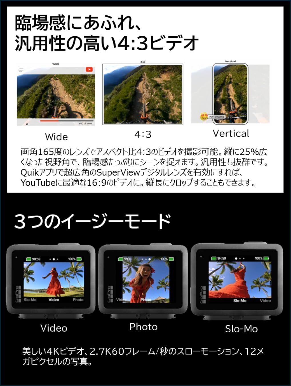 【臨場感にあふれ、汎用性の高い4:3ビデオ】HEROなら、画角165度のレンズでアスペクト比4:3のビデオを撮影可能。縦に25%広くなった視野角で、臨場感たっぷりにシーンを捉えます。汎用性も抜群です。Quikアプリで超広角のSuperViewデジタルレンズを有効にすれば、YouTubeに最適な16:9のビデオに。TikTokなどのSNSに投稿する場合は、縦長にクロップすることもできます。