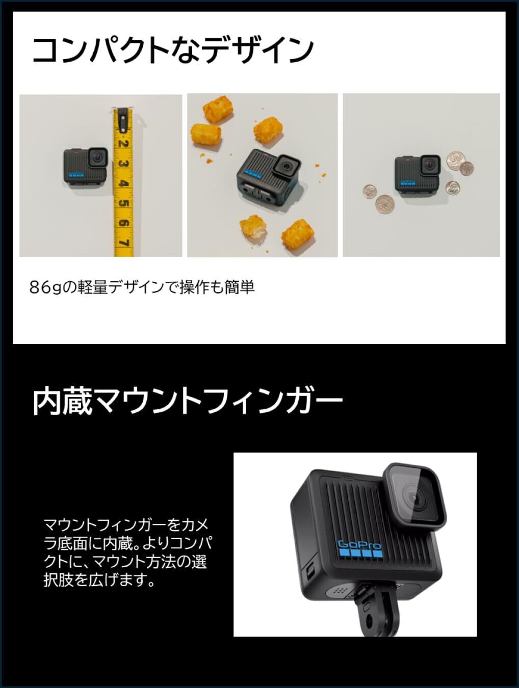 GoPro最小の4Kカメラ。徹底的にコンパクト。重量はわずか86グラムで、HERO12 Blackと比べて44%軽量化、35%小型化。驚異の4Kビデオと12MP写真を撮影可能。テレビやスマートフォンでの全画面再生に最適な16:9のアスペクト比。165度の視野角で臨場感あふれるPOVショットを実現。QuikアプリでHyperSmoothビデオブレ補正を使用可能。