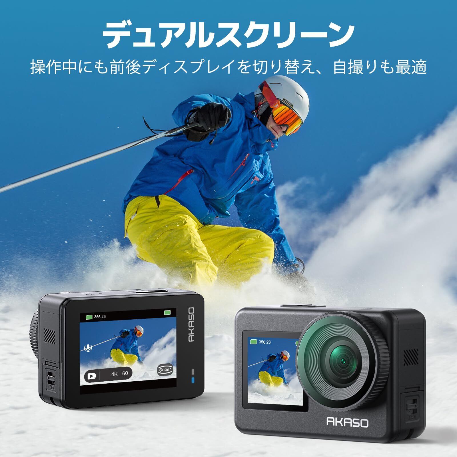【アップグレード4K60fpsカメラ】 最高4K/60FPS解像度、20MP画素を搭載したAKASO Brave 7アクションカメラを使用すると、素晴らしい写真や高精細でビオを撮影でき、人生の美しさと驚異をはっきりと記録できます。革新的なデュアルカラースクリーンデザインにより、背面と前面の視野角を自由に変更できます。特に、2インチのリアタッチスクリーンは応答性が高い、優れたクリアな再生体験を提供できます。