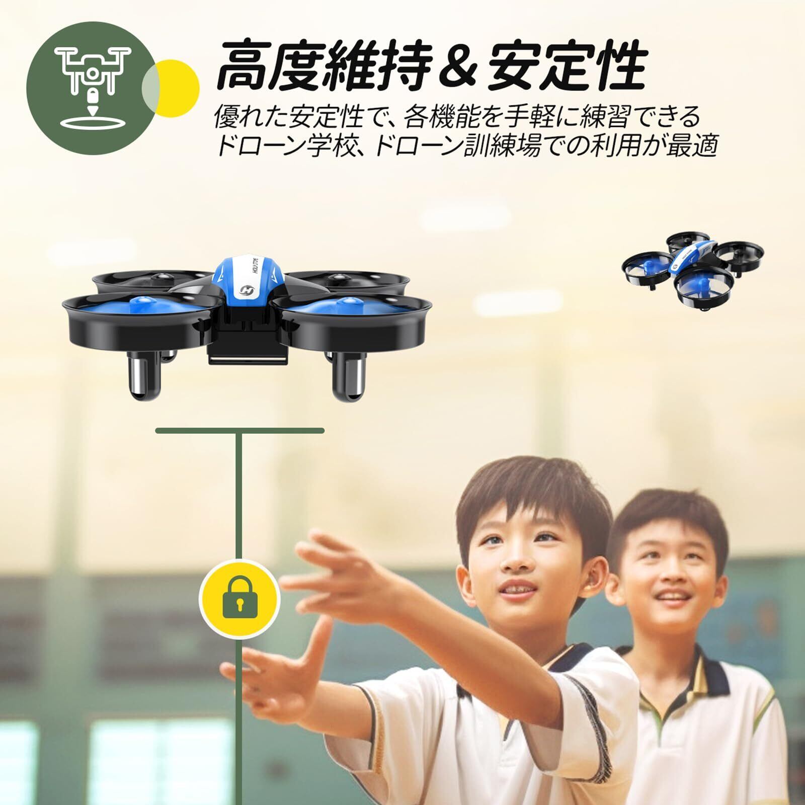 【初心者向け】6軸ジャイロを採用した気圧センサー高度維持機能により、機体はスロットルを離れた位置で高度を維持します。ワンキー起動/着陸ボタンが付き、操作が簡単で子供でも心配なし。モード1とモード2があり、操作性の好みと需要にあわせて切り替えます。