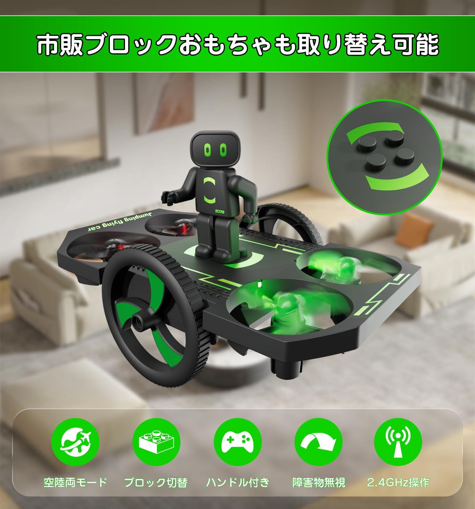 ドローン 8歳子供向け 100g未満 ミニ 小型 空陸対策 室内用RCクアッドコプター おもちゃ 陸上走行モード・空中飛行モードモコン ヘッドレスモード フリップモード搭載 操作ジャンピング・フライングカー サークル飛行・360度フリップ・高度維持 バッテリー2個付き 技適認証済 プレゼント最適 (グリーン(カメラなし))