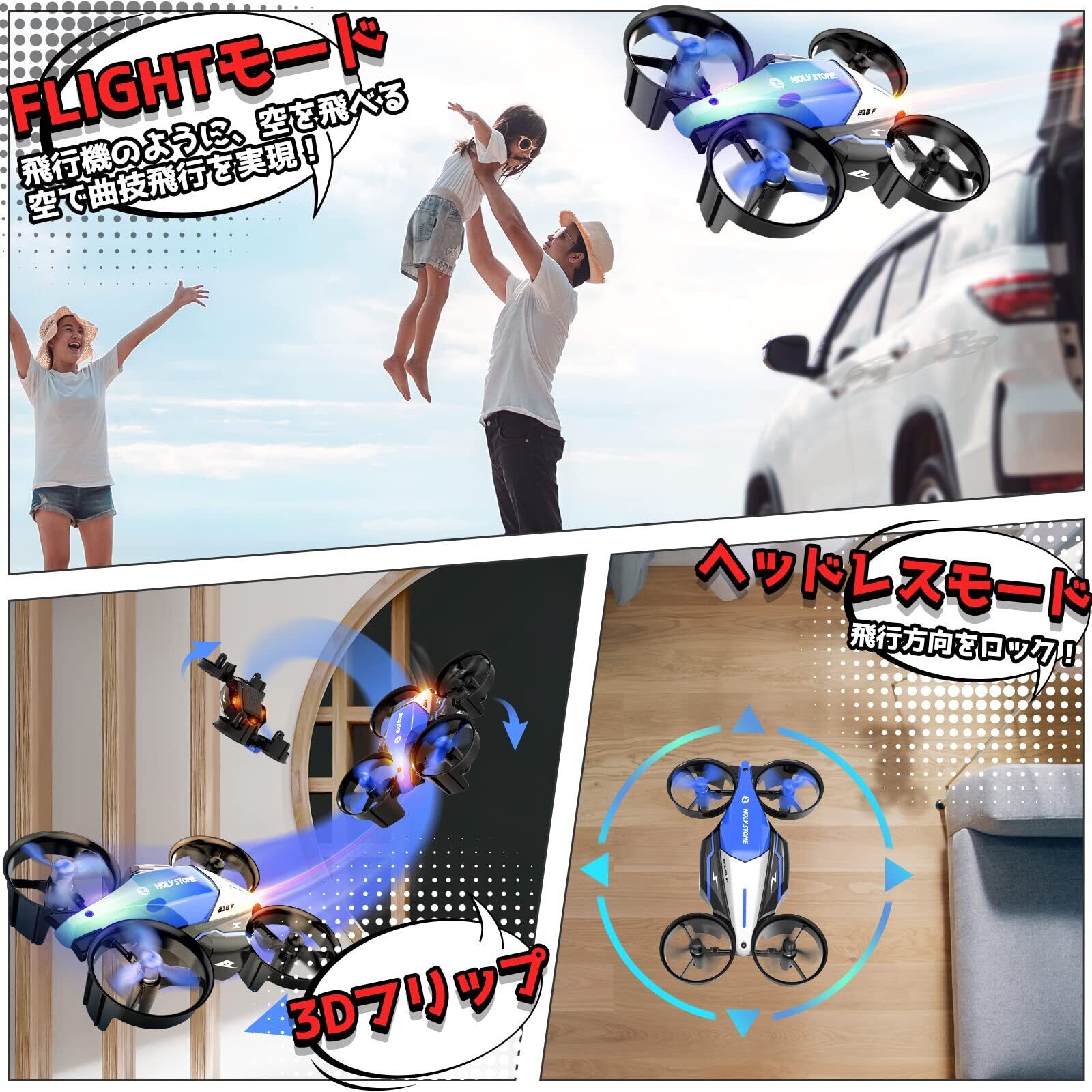 【陸・空両用】2つの操作モード、2つの遊び方、陸・空両用ドローンがもっと楽しくなります!子どもへの面白いプレゼントに最適です。FLIGHTモードでは、本製品がドローンのように空を飛び、LANDモードでは、リモコンカーのように地上を走ります。