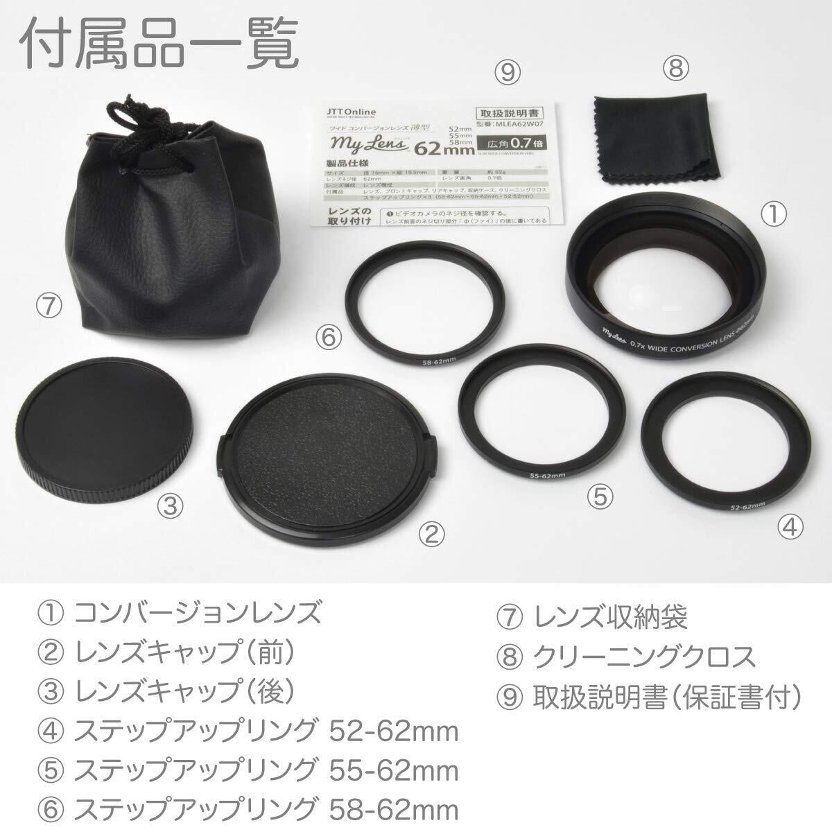 My Lens (マイ レンズ) ビデオカメラ用 広角 0.7倍 薄型 ワイドコンバージョンレンズ レンズ径 52mm 55mm 58mm 62mm 対応 Full HD VIDEO対応 JTT Online MLE62W07
