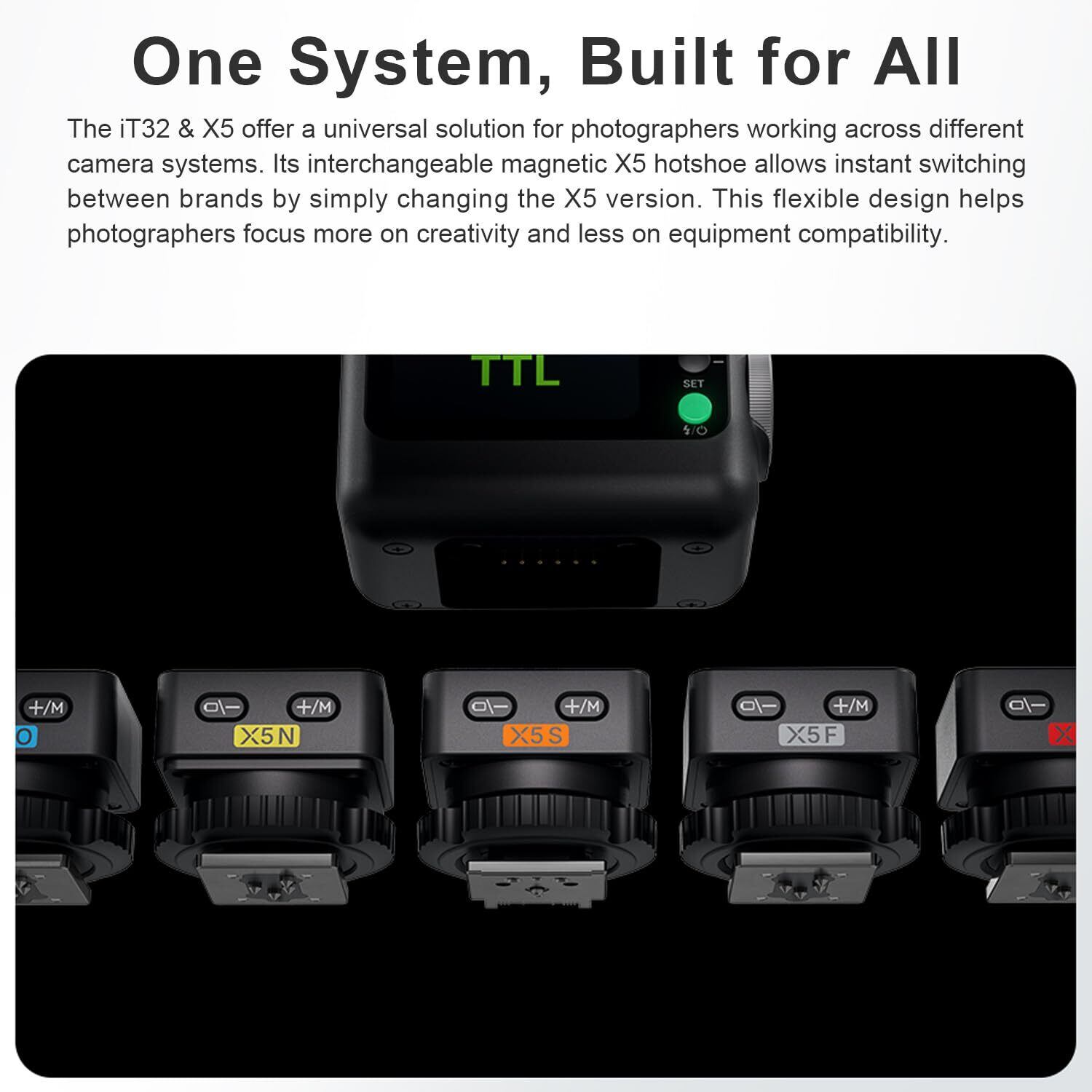 X5(C,N,S,F,O)送信機は単品として使用不可です、iT32カメラフラッシュと組み合わせて使用する必要があります。
