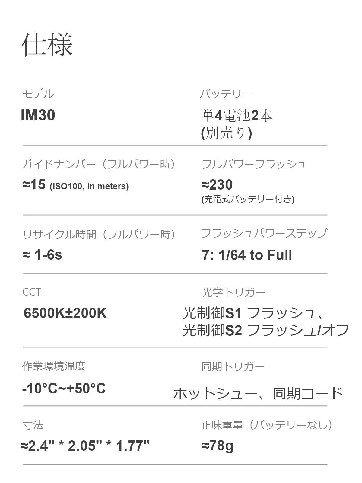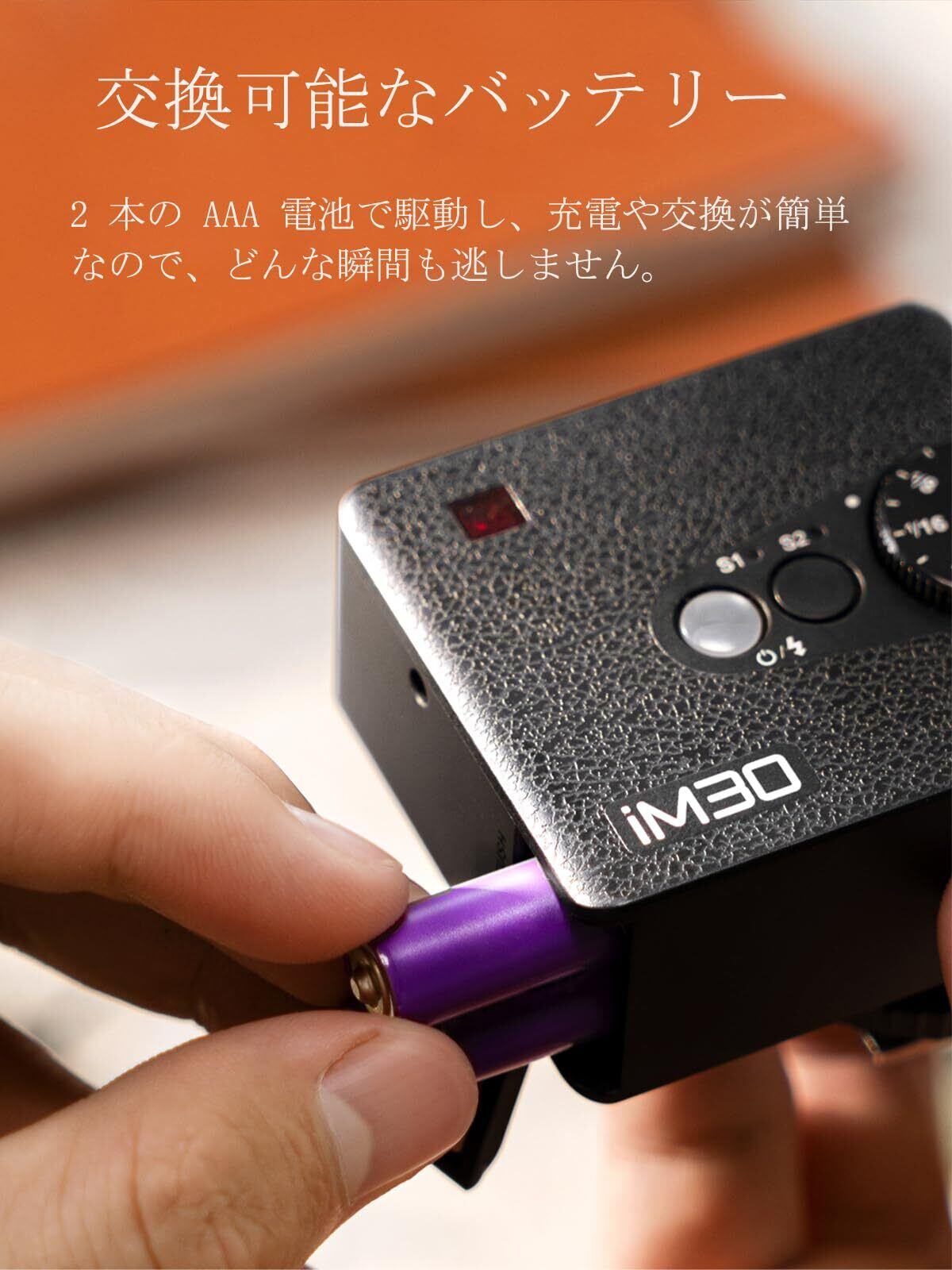 AAAバッテリーによる信頼性の高い電力: Godox IM30は2つのAAAバッテリー(別売)で動作し、1回の充電で最大230回の発光が可能です。バッテリーの交換が簡単で、長期間の使用でも充電式バッテリーの劣化を心配することなく使用できます。