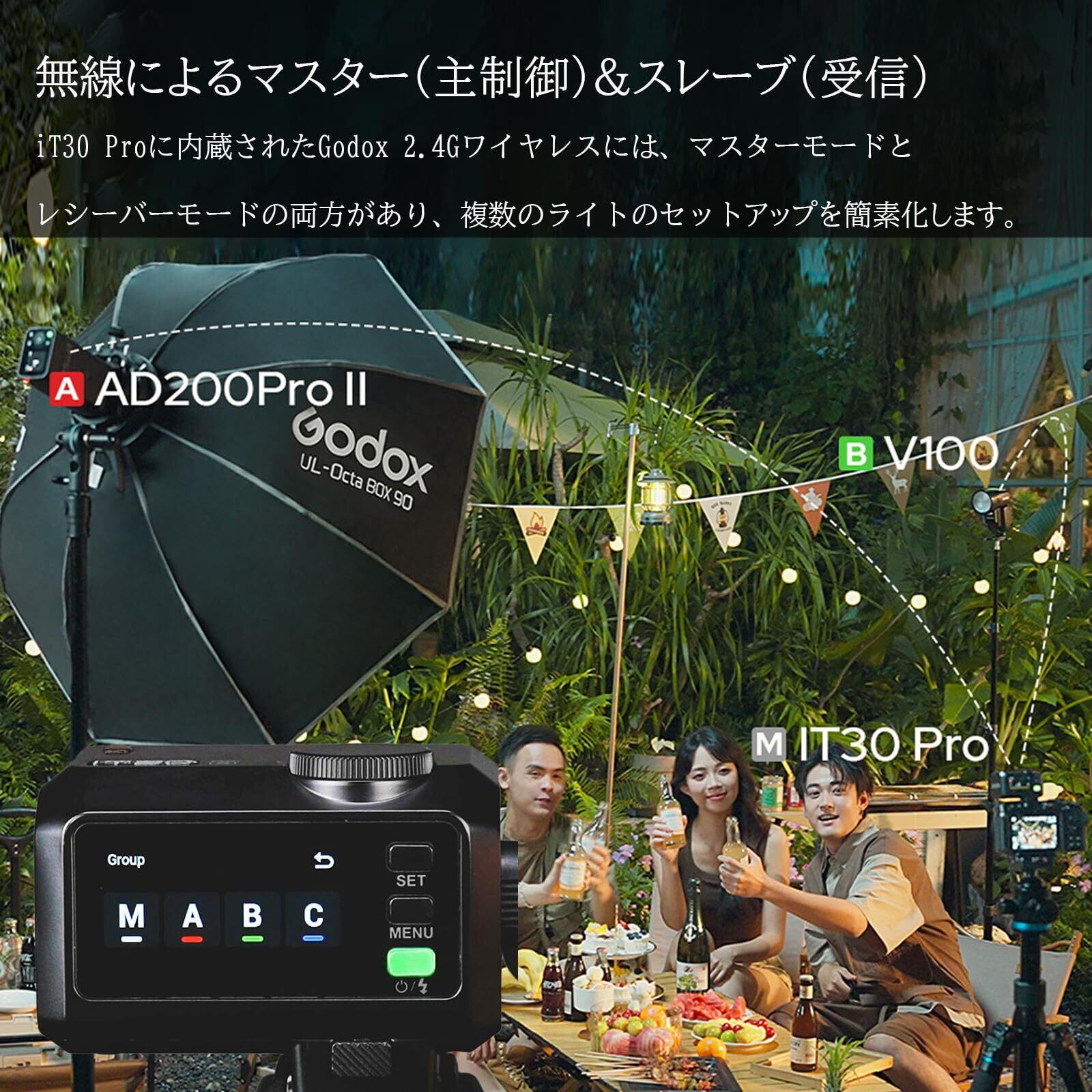 多灯撮影も自在 – Godox IT30PRO S Sony はGodox 2.4GHz Xシステムを内蔵し、マスター・スレーブ両方に対応。1/8000秒HSSや前幕・後幕シンクロ、さらにSバージョンはソニー対応カメラで最大1/80000秒のグローバルシャッター同調を実現。