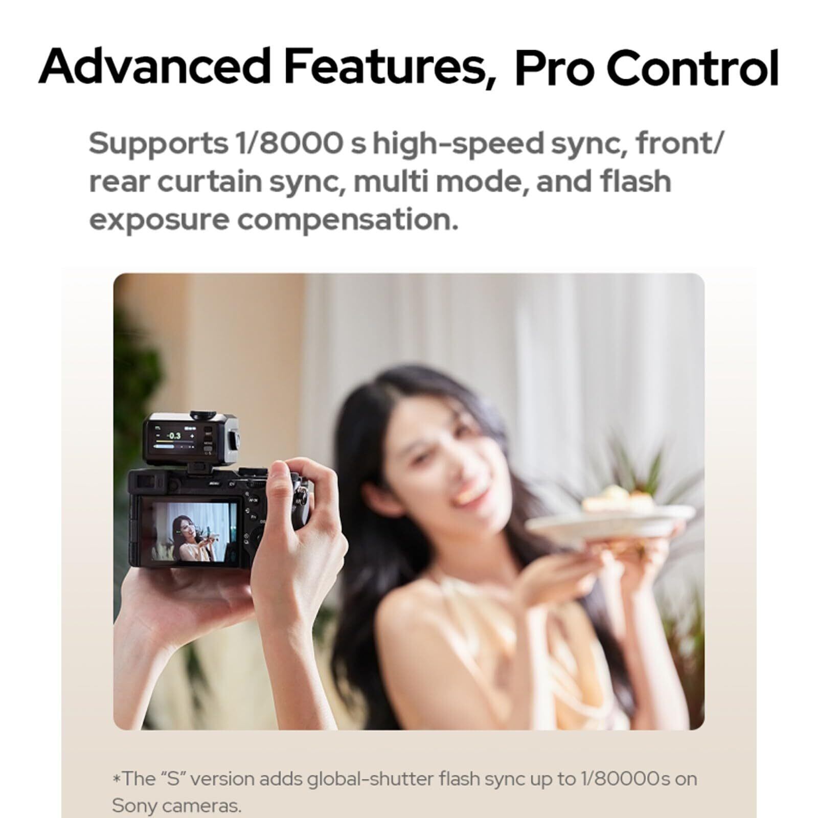 高度な機能、プロコントロール:1/8000秒ハイスピードシンクロ、先幕/後幕シンクロ、マルチモード、フラッシュ露出補正に対応。*「S」バージョンでは、ソニー製カメラで最大1/80000秒のグローバルシャッターシンクロに対応しています。