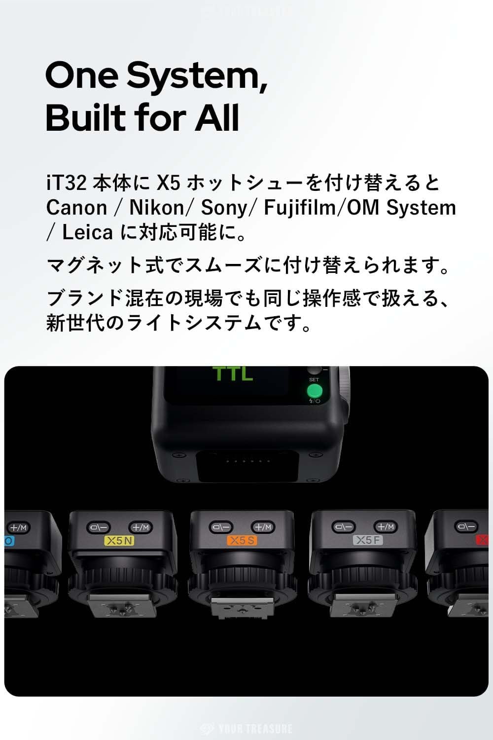 【X5トリガーの交換で主要5ブランドに対応】 iT32本体は共通、X5ホットシューを付け替えるだけでCanon/Nikon/Sony/Fujifilm/OM System に対応可能。 ブランド混在の現場でも同じ操作感で扱える、新世代のライトシステムです。