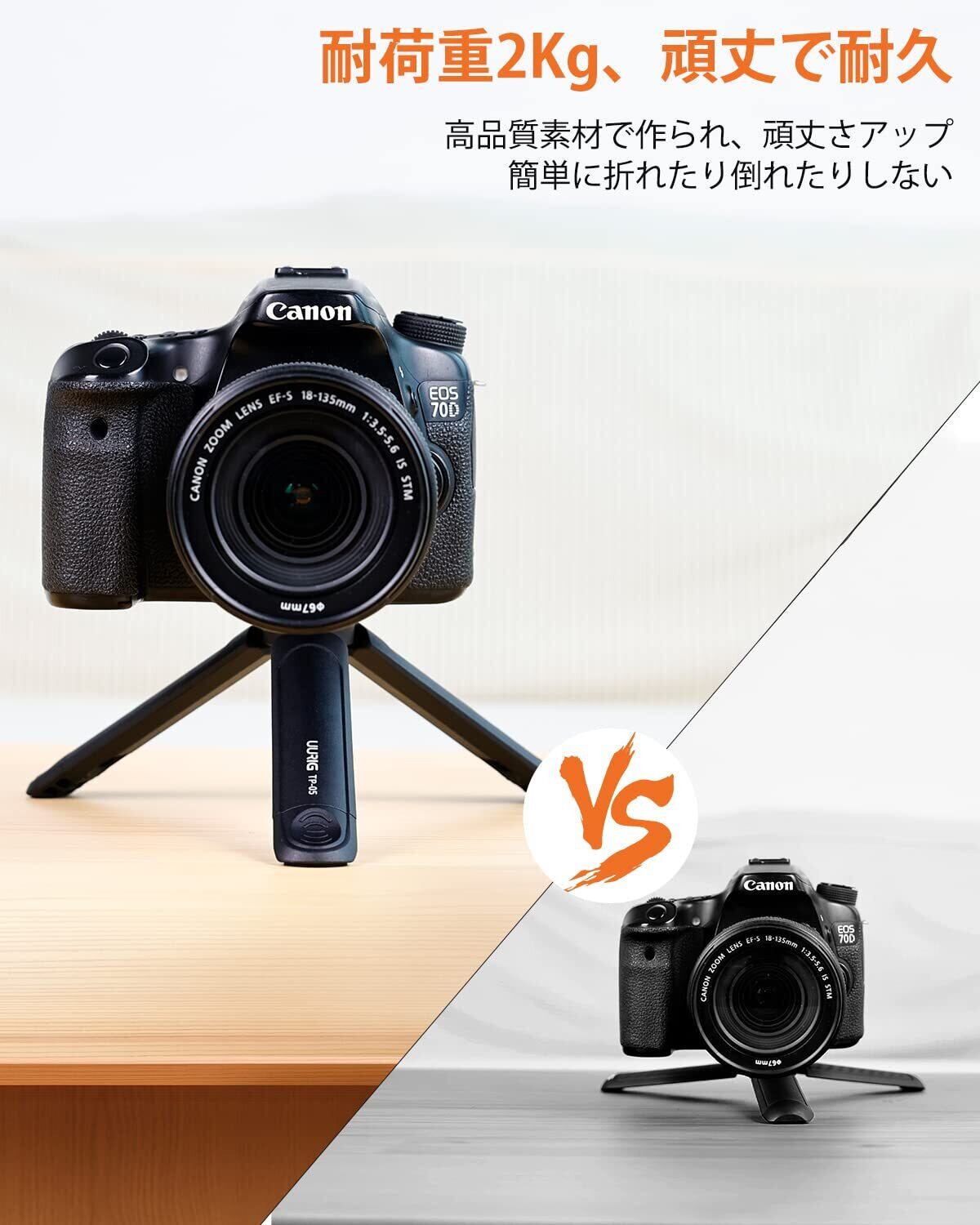 【2段階伸縮可能な足】ミニ三脚は異なる高さのデバイスに満たすために、2つのモードに設計されています。圧力を受ける面積を拡大でき、デバイスをより安定になります。ご注意:拡張した後、安定性が上がったが、耐荷重が下げることがあります、推奨耐荷重2Kgです。