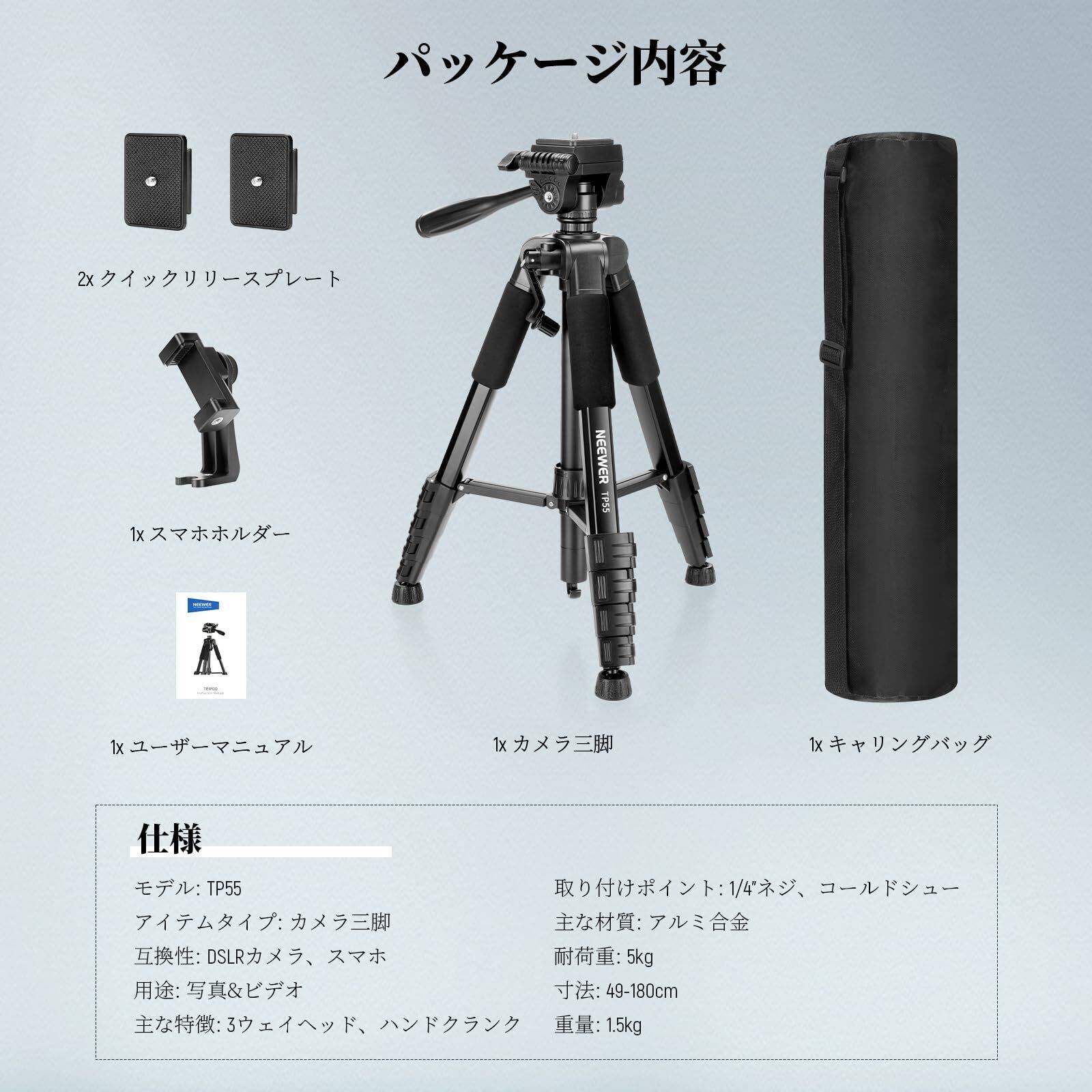 NEEWER BASICS 180cm カメラ三脚 ビデオ三脚 スマホホルダーマウント/3ウェイパンチルトヘッド付き 撮影用三脚 アルミ製 軽量 ポータブル トラベルスタンド 旅行三脚 コンパチブル iPhone 16 Pro Max 15/Galaxy S25 S24 Ultra/Android ビデオ録画用 TP55