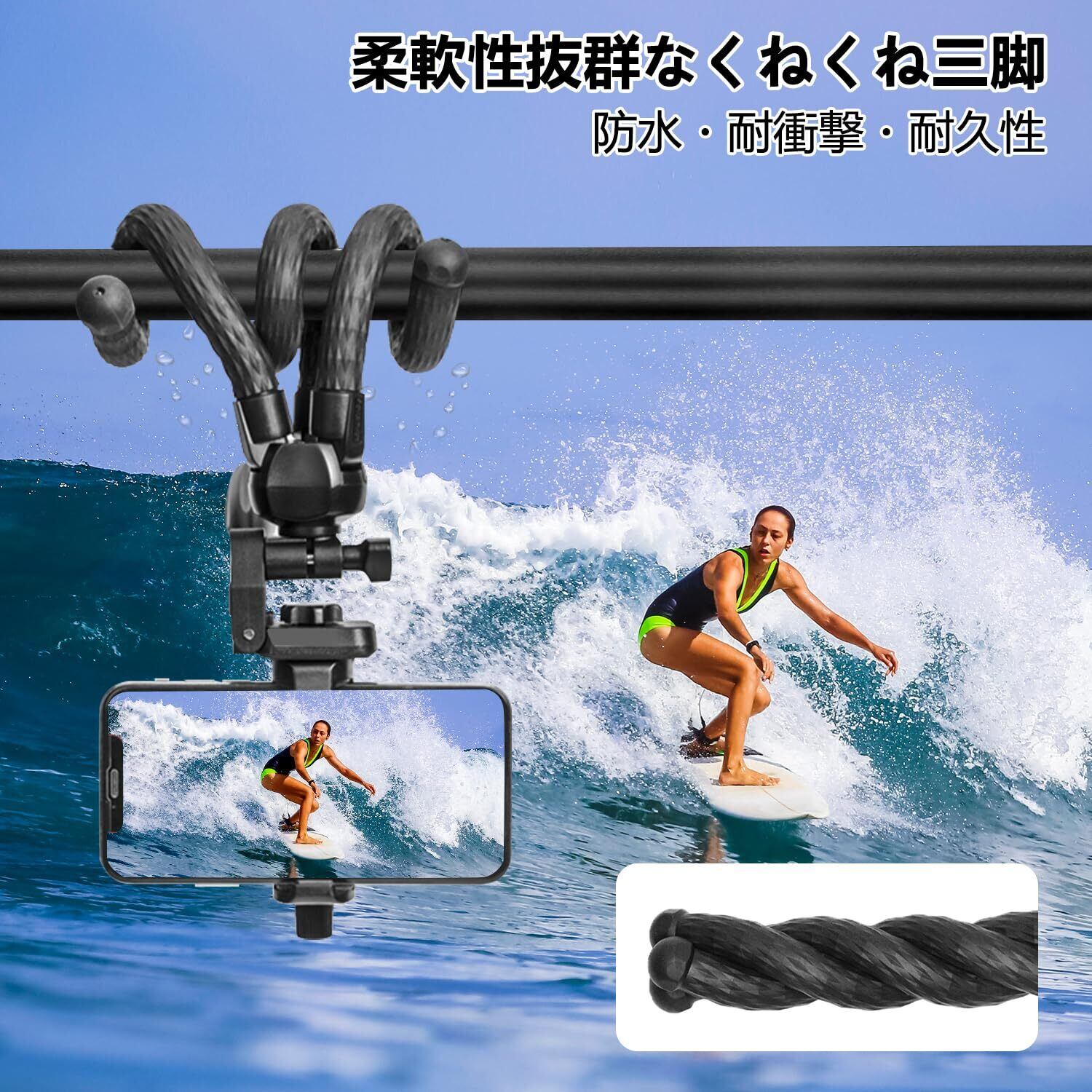 【耐久性・耐食性】くねくねミニ三脚は高強度・高弾性のゴムを採用して、頑丈で耐久性があります。海にでも使用可能で、防水で耐食性も強いです。くねくね三脚をお好きな形に繰り返して曲げても、折れしなく、長く愛用できます。