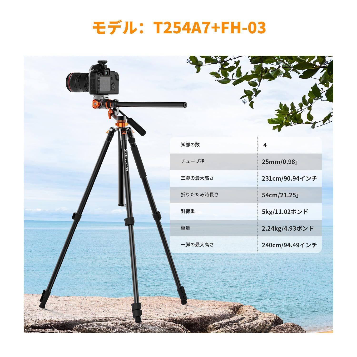 カメラ三脚一眼レフ K&F Concept 俯瞰撮影 ビデオカメラ三脚 231cm 三脚ブーム 中心軸横断 俯瞰撮影 パノラマ撮影 28mm大口径中心軸4段伸縮 360度回転 自由雲台 一脚可変式 1/4 "クイックシュー付き アルミ 最大耐荷重5Kg ビデオ/一眼レフカメラ/デジタルカメラ/スマホに対応