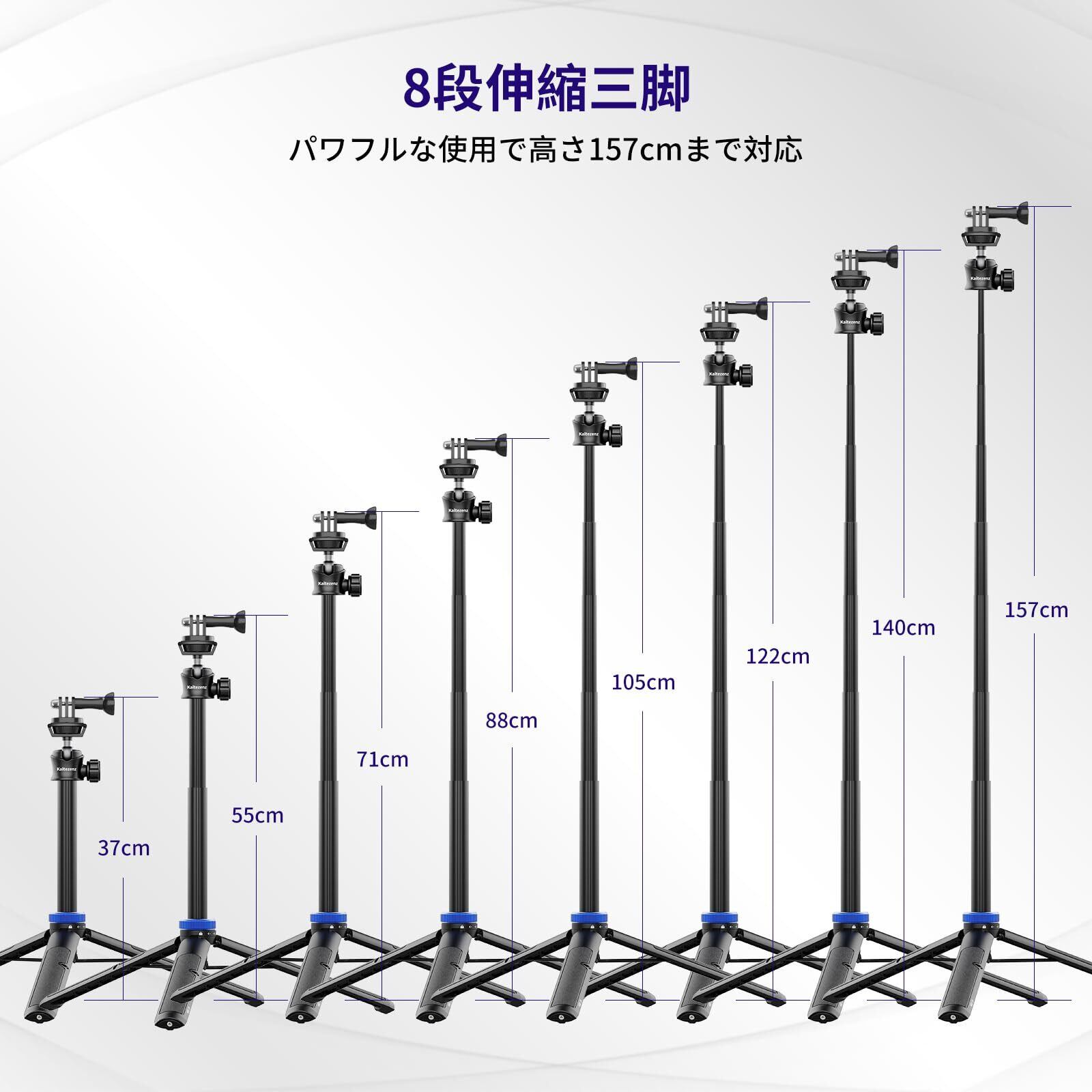 ▶【Gopro用157cmカメラ三脚】8段伸縮式、最大157cmまでの高さ調整。KT-1004自撮り棒三脚、32.5cmから157cmまで、非常に滑らかに伸縮し、8段階の長さに伸ばしてもしっかり支え、あらゆる撮影ニーズに対応します。