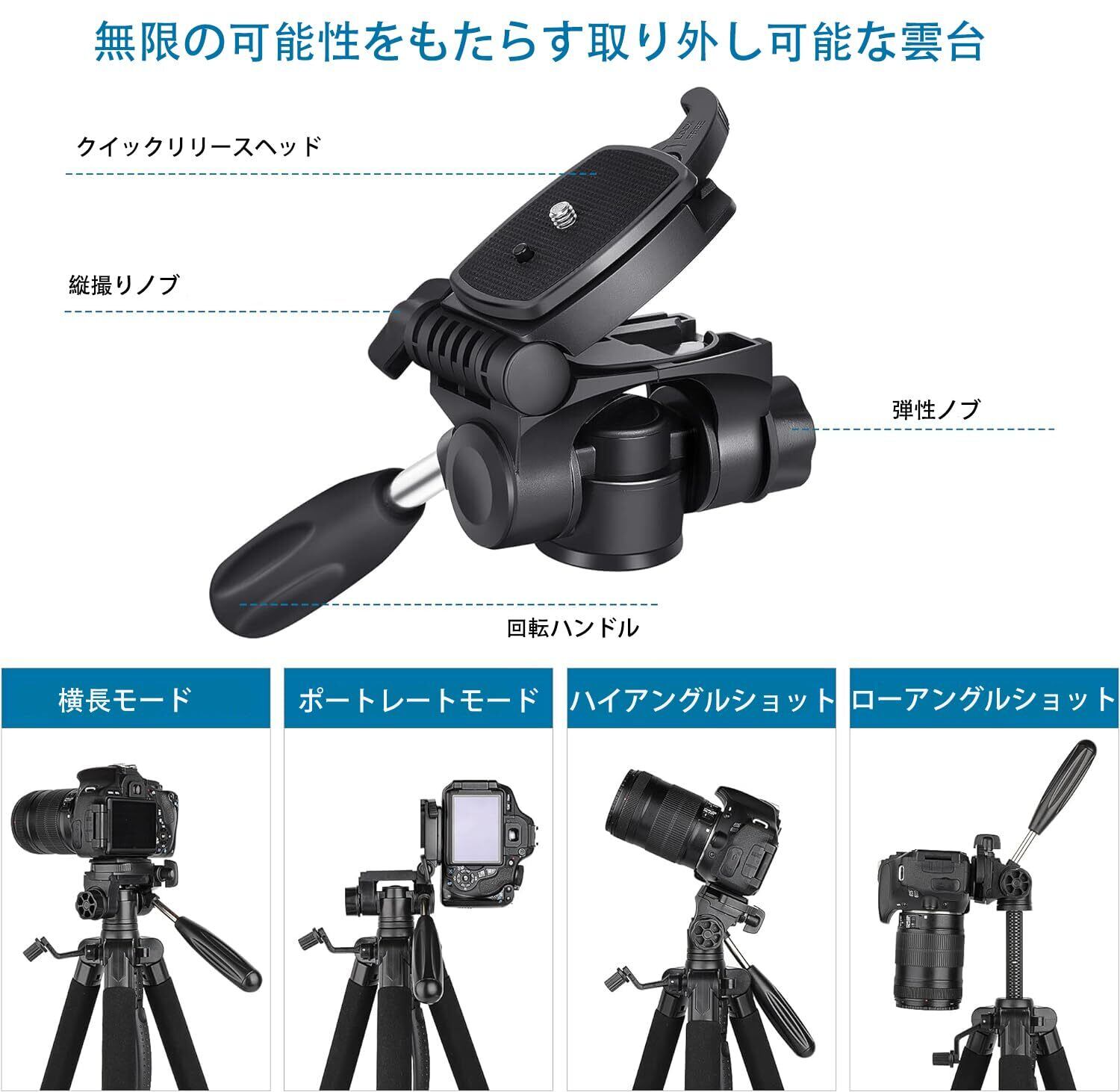 【360度パノラマ撮影】洗練された3WAY雲台は、三脚を横/縦/水平方向どれでも自由に調節できます,構図の微調整や手ブレ防止を重視したい方に適しています、水準器も搭載されていますので、カメラ 水平状態を一目で確認することができます。