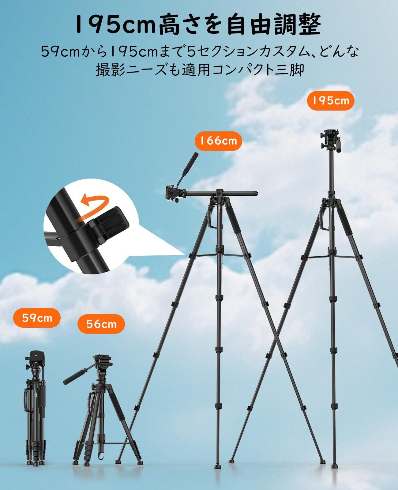 【収納バッグ付き、持ち運び便利】VRIG三脚本体重さ1.8kg、収納後サイズ59cm。アルミ合金及びABSなどの素材で作られ、頑丈の上に手軽に持ち運べます。6セクション無段階伸縮仕様で、高さ59cmから195cmまで簡単に調節できます。旅行、登山撮影、Vlog、ビデオ、ライブ配信に大活躍です。
