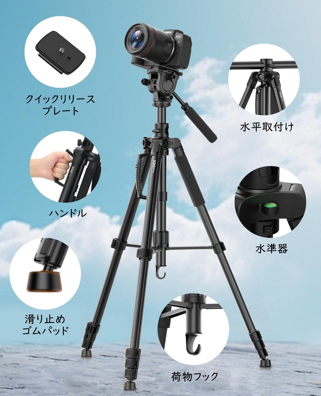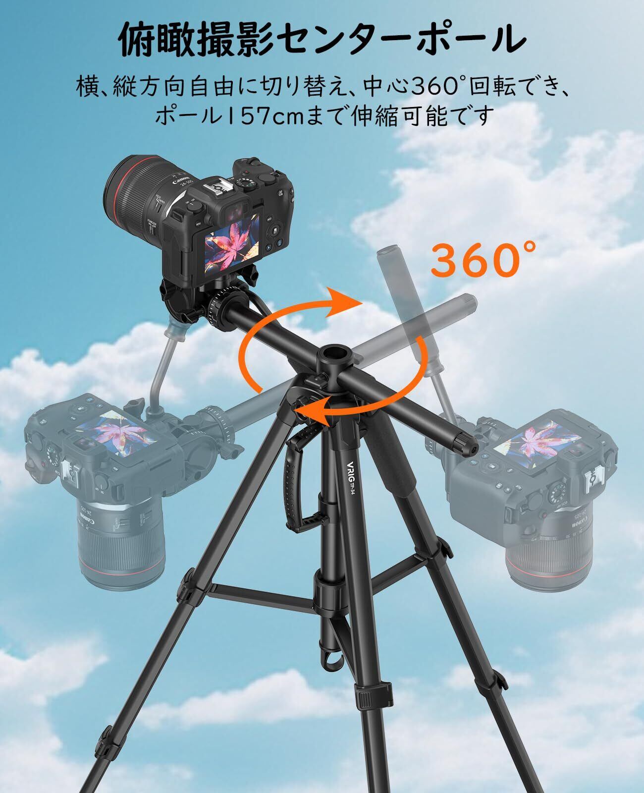 【多機能3WAY雲台、取外し可能】VRIGカメラ三脚は取外し可能な中心軸と取外し可能な雲台のデザインで、雲台付き単脚、1/4ネジの自撮り棒に簡単変換。水準器付きのカ三脚雲台には上下・左右・水平方向・360度自由に調整可能、カメラ写真/ビデオなどより多くの場合に好き勝手な撮影が実現します。